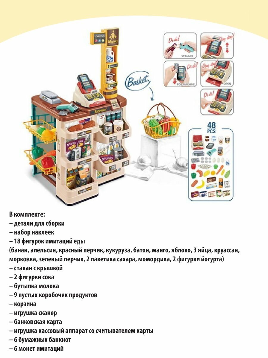 Детский супермаркет 668-113, для девочек и мальчиков, 58 предметов, звук, свет