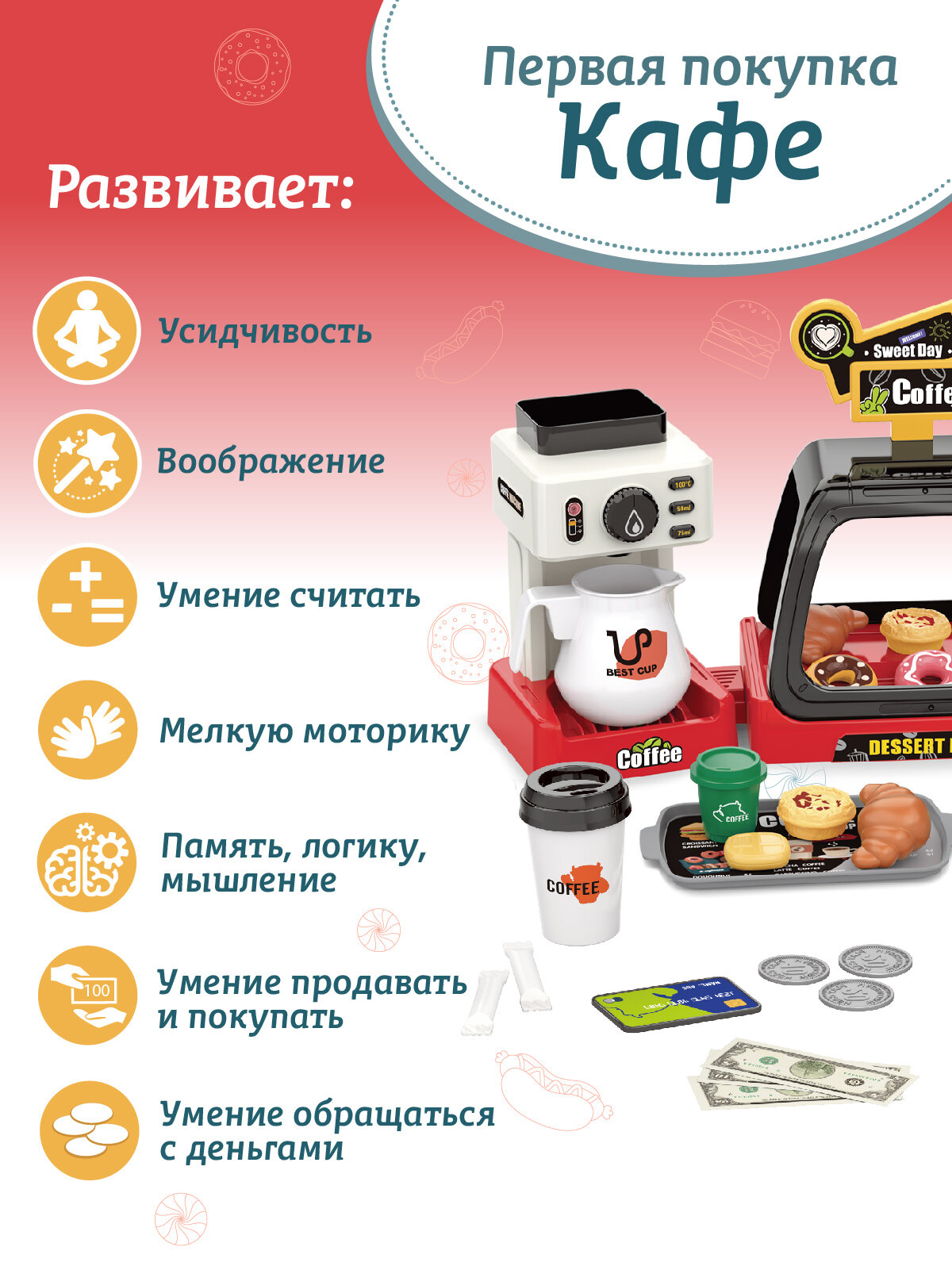 | Комплектация | кофе-машина / кондитерский шкаф / десерты / банкноты / монетки / кредитная карта |