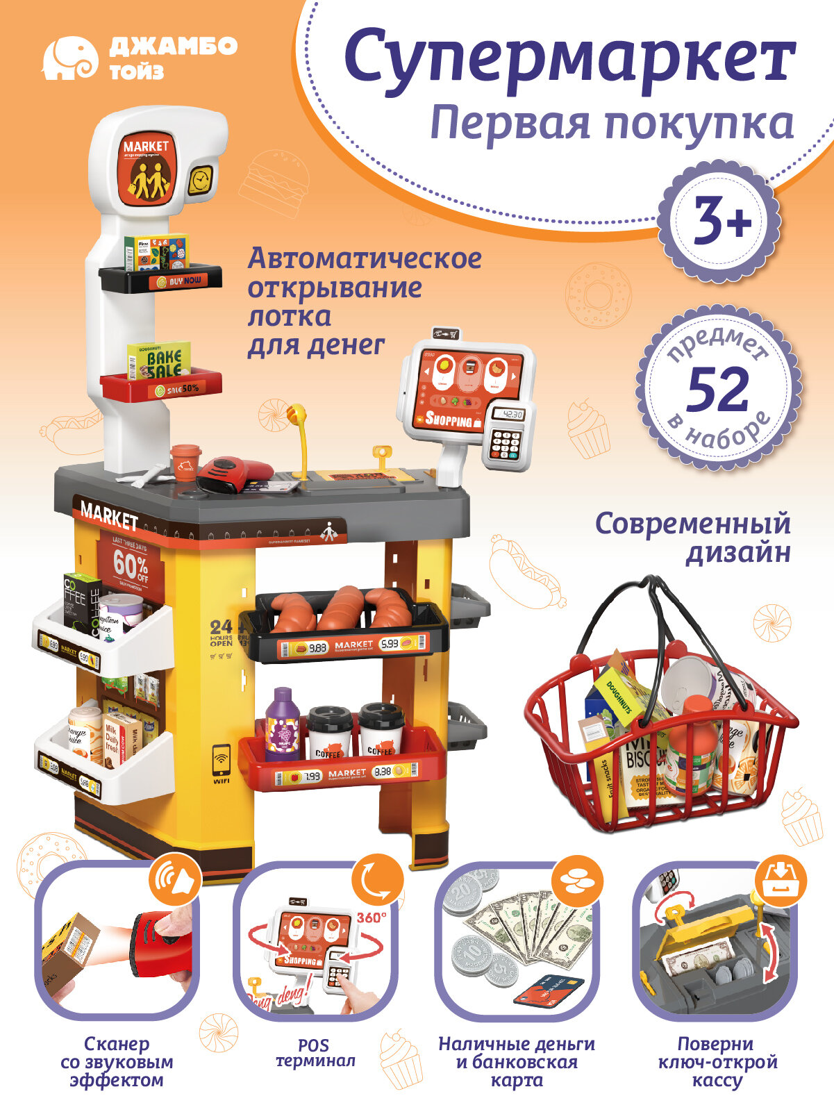 Супермаркет Первая покупка с корзинкой, сканер/терминал/деньги, свет/звук, JB0212820 информация: