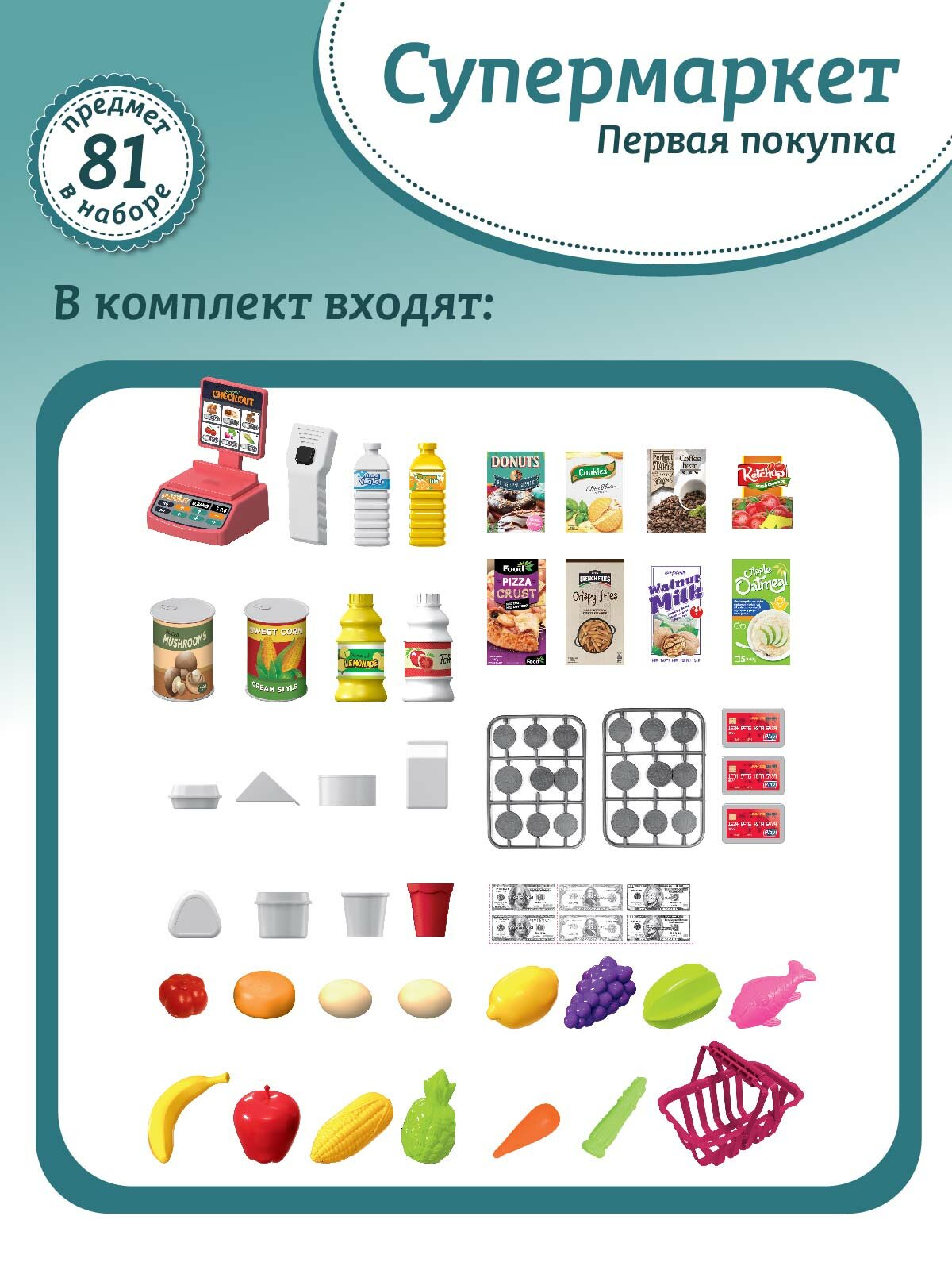 Супермаркет Первая покупка с корзинкой, игровой набор, сканер/терминал/деньги, свет, звук, JB0213099 информация: