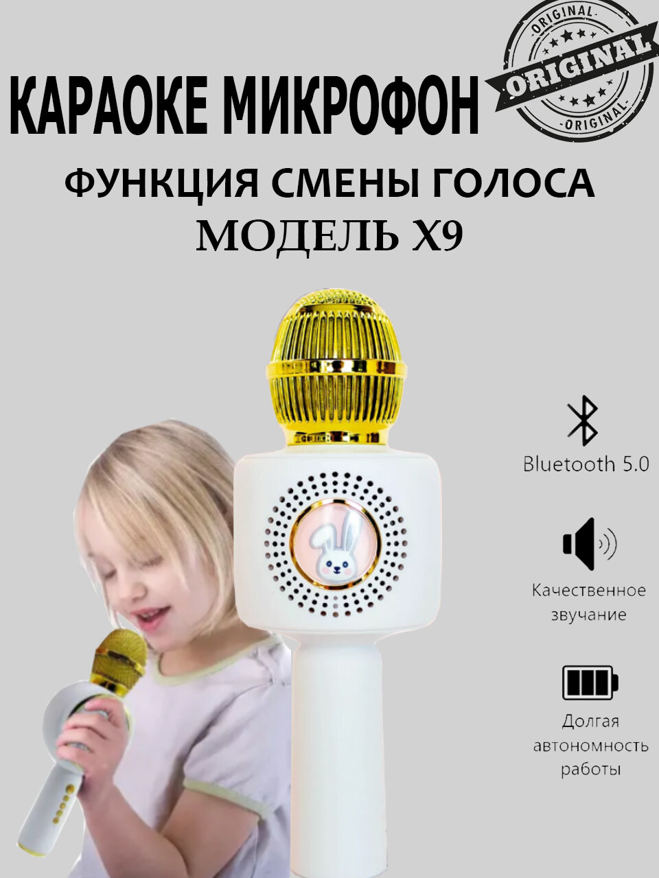 Детский микрофон караоке с колонкой, сменой голоса, подсветкой, кролик белый информация: