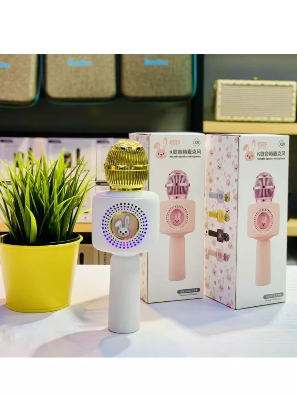 10 цен на Детский микрофон караоке с колонкой, сменой голоса, подсветкой, кролик белый