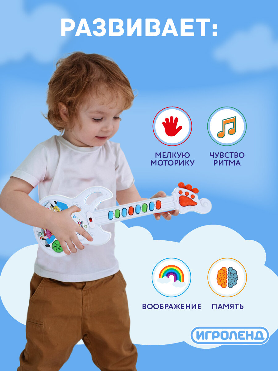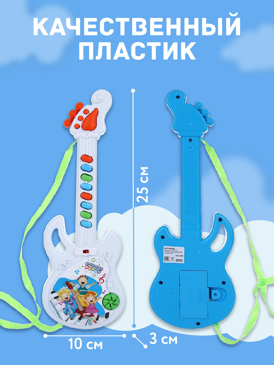 10 цен на Гитара детская МЕШОК ПОДАРКОВ, детский музыкальный инструмент, 2хАА, 10х25х3см