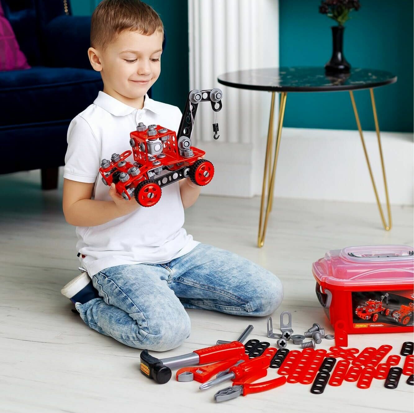 Чемоданчик мастера - детские инструменты, винты, гайки, пластины для закручивания - 152 эл. в контейнере с машинкой-эвакуатором / Полесье информация: