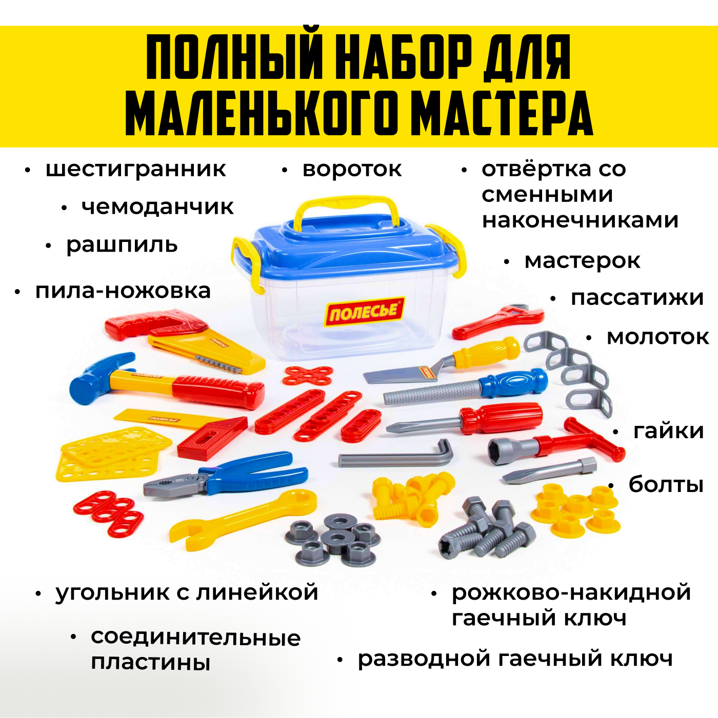 Набор детских игрушечных инструментов для детей в чемоданчике от бренда "Полесье"57 предметов информация: