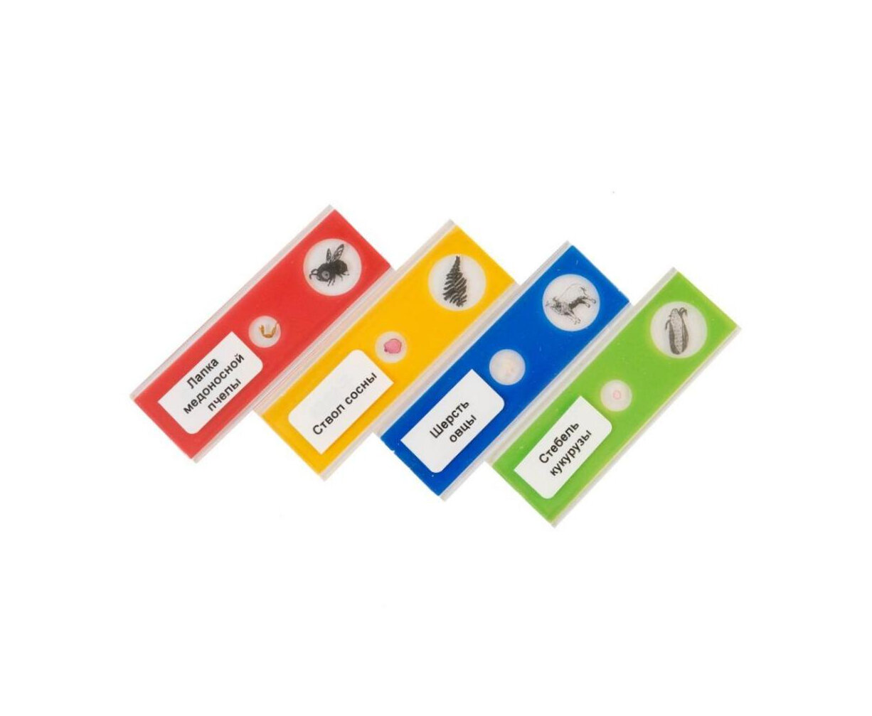 10 цен на Комплект микропрепаратов 48 слайдов (4х12) насекомые, животные, растения, овощи для микроскопа. Русский язык.