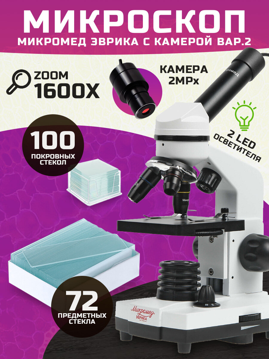 10 цен на Микроскоп Микромед "Эврика" 40x-1600x, с видеоокуляром и набором предметных и покровных стекл