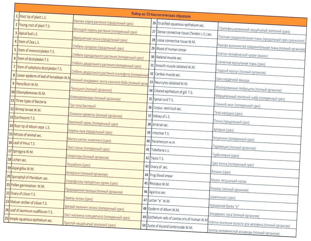 10 цен на Комплект готовых микропрепаратов 50 штук на русском языке для микроскопа. Стекло. Микропрепарат почка, яичник, лук