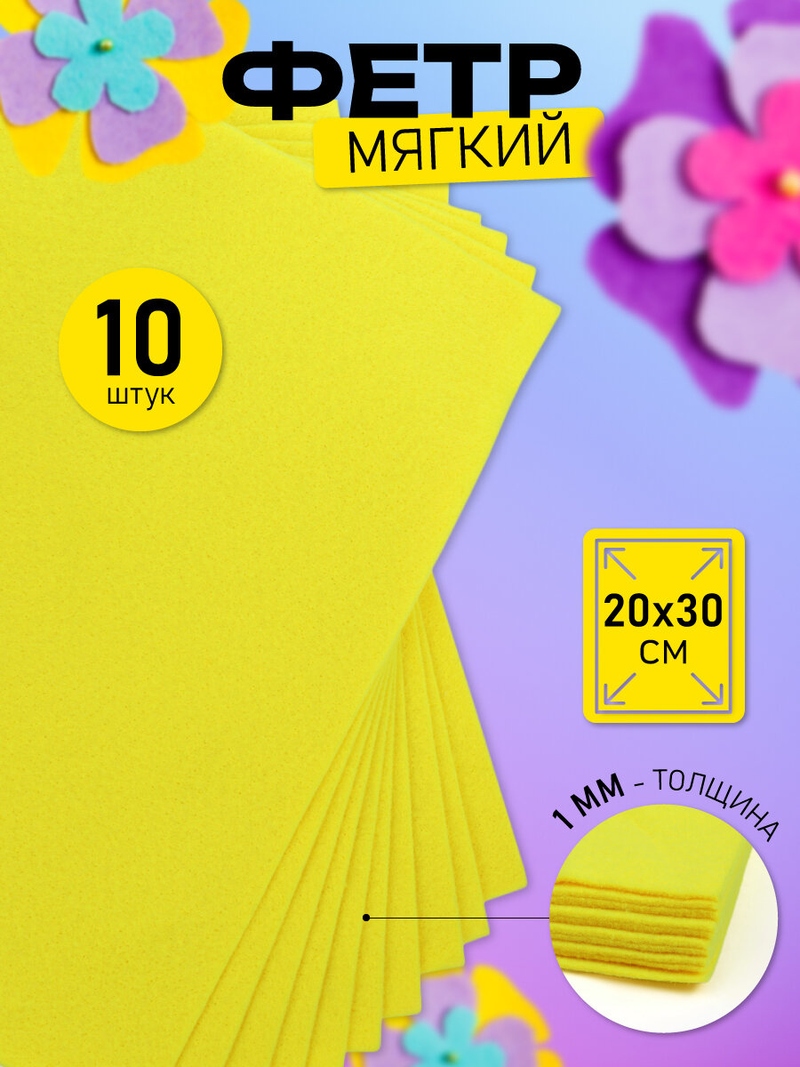 Отзывы на Фетр листовой мягкий Magic 4 Hobby 1мм 20х30см арт. FLT-S1 уп.10 листов цв.633/038 лимон