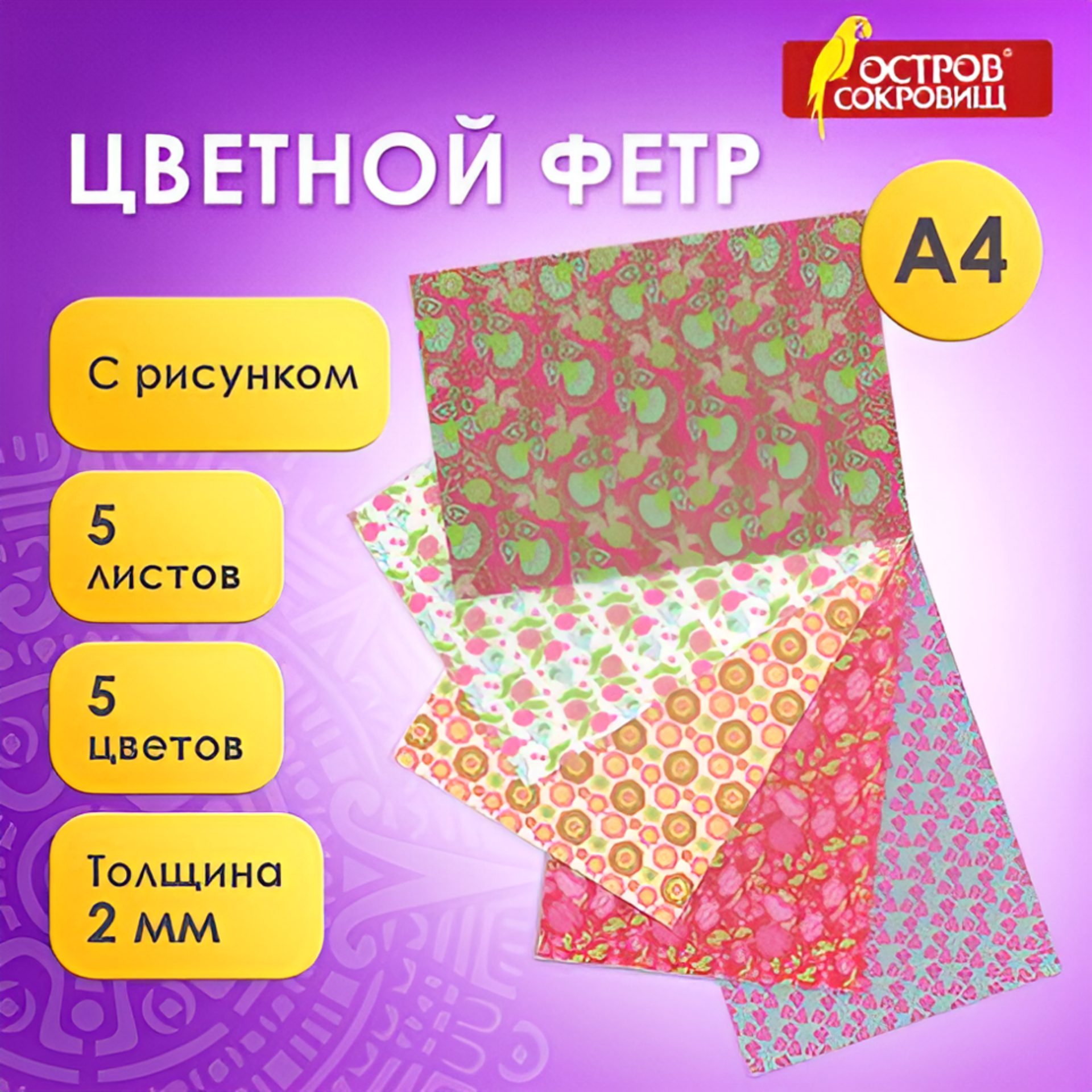 Цветной фетр для творчества, А4, ОСТРОВ СОКРОВИЩ, с рисунком, 5 листов, 5 цветов, толщина 2 мм, "Цветы" информация: