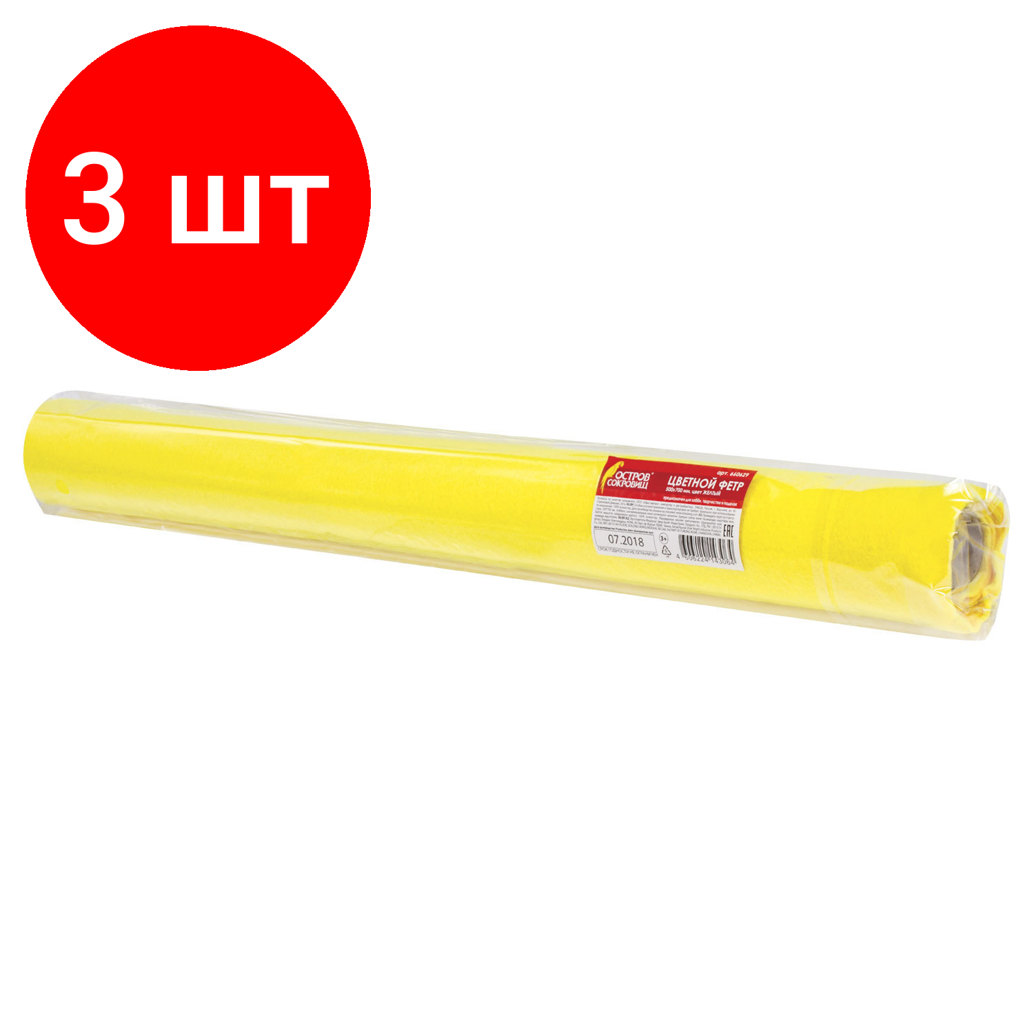 Комплект 3 шт, Цветной фетр для творчества в рулоне 500х700 мм, остров сокровищ, толщина 2 мм, желтый, 660629 информация: