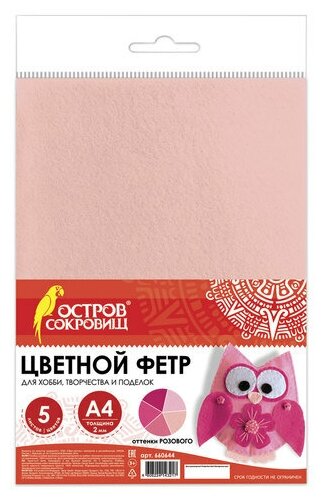 10 цен на Цветной фетр мягкий А4, 2 мм, 5 листов, 5 цветов, плотность 170 г/м2, оттенки розового, остров сокровищ, 660644, 2 упаковки
