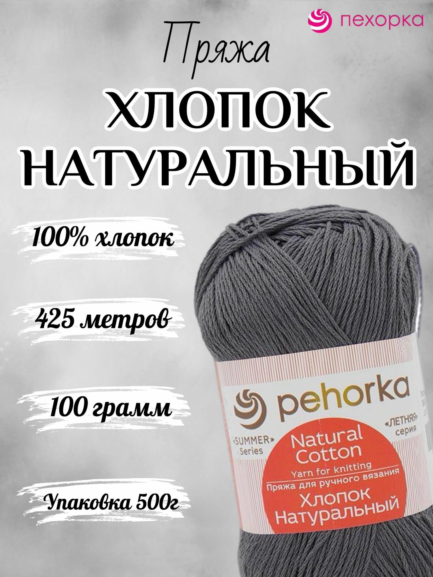 10 цен на Летняя пряжа Хлопок натуральный 425м Пехорка, цвет 393 светлый маренго, 5 мотков