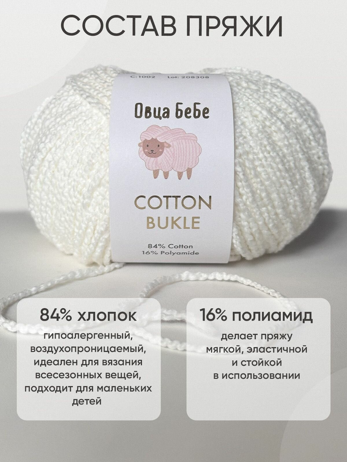 Пряжа Cotton Bukle для вязания буклированная, цвет топленое молоко (набор из 5шт) 2 316 ₽