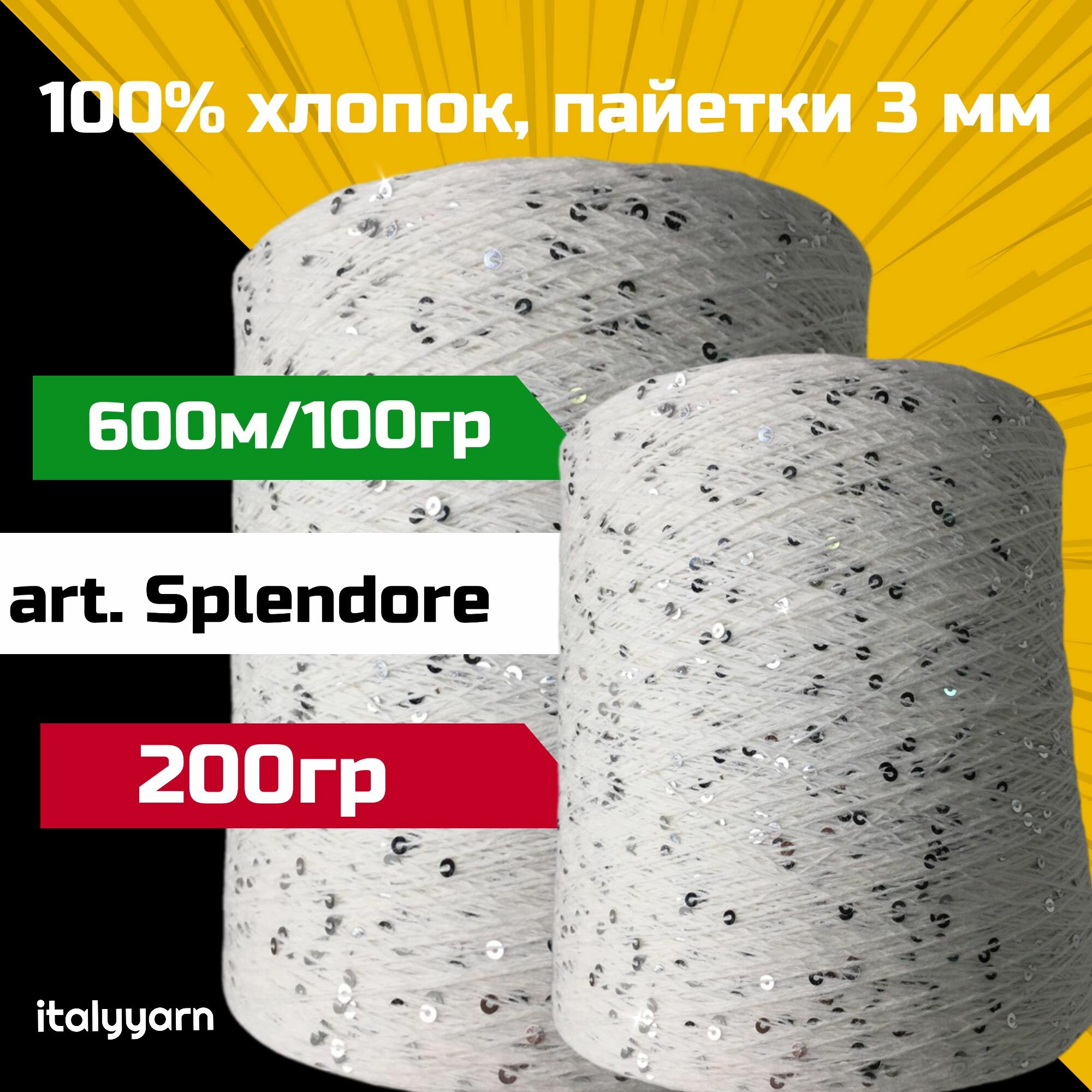 SPLENDORE; пайетки 3мм на нити из 100% хлопка; 600м/100гр; вес: 200гр; цвет: белый; italyyarn информация: