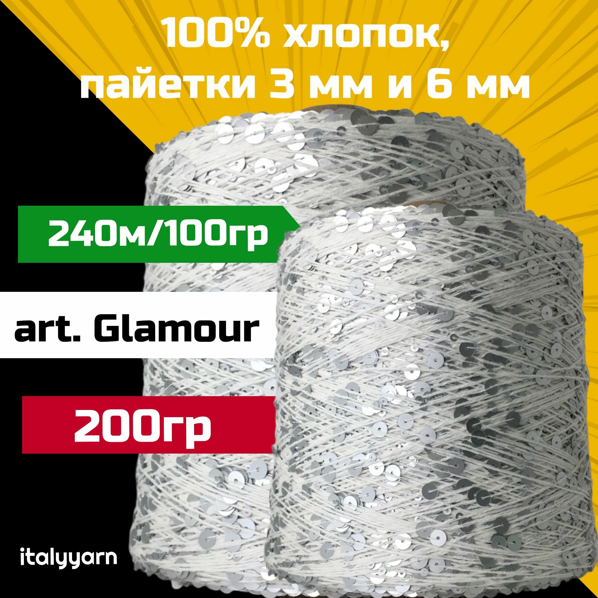 GLAMOUR; пайетки 3мм и 6мм на нити из 100% хлопка; 240м/100гр; вес 300гр; italyyarn 2 111 ₽