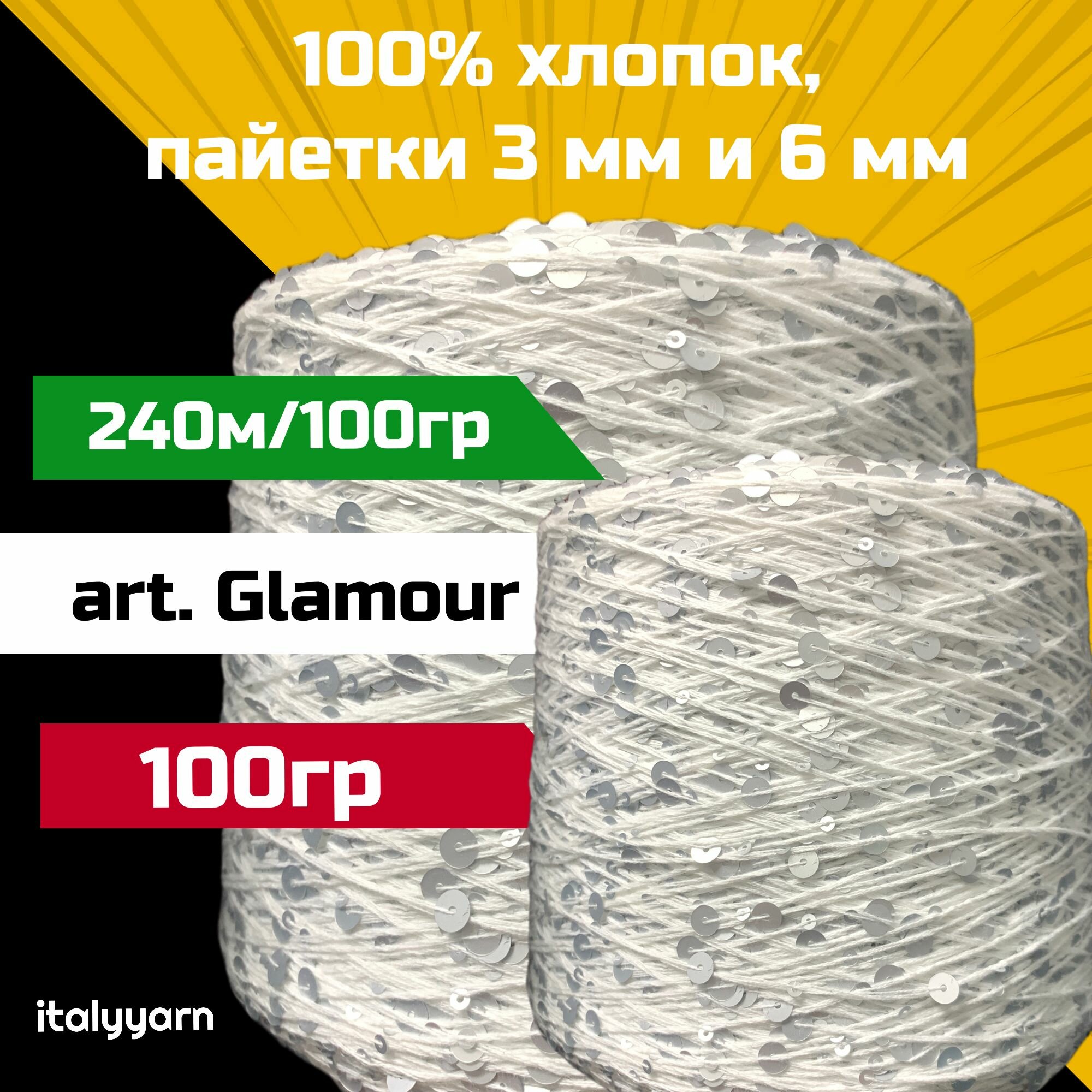 GLAMOUR; пайетки 3мм и 6мм на нити из 100% хлопка; 240м/100гр; вес 300гр; italyyarn 2 111 ₽