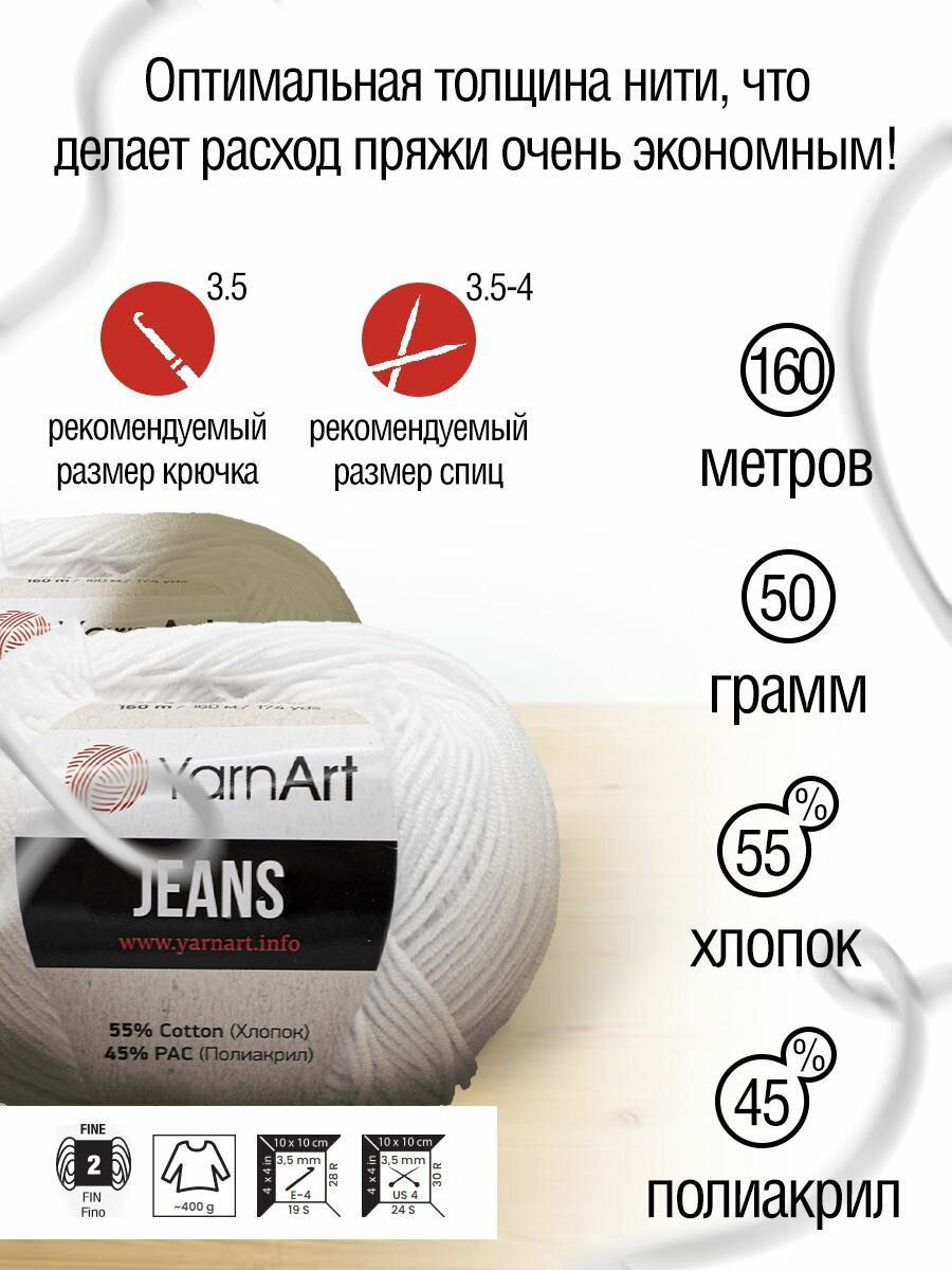 Пряжа для вязания YarnArt 'Jeans' 50г, 160м (55% хлопок, 45% полиакрил) (62 белоснежно-белый), 10 мотков информация: