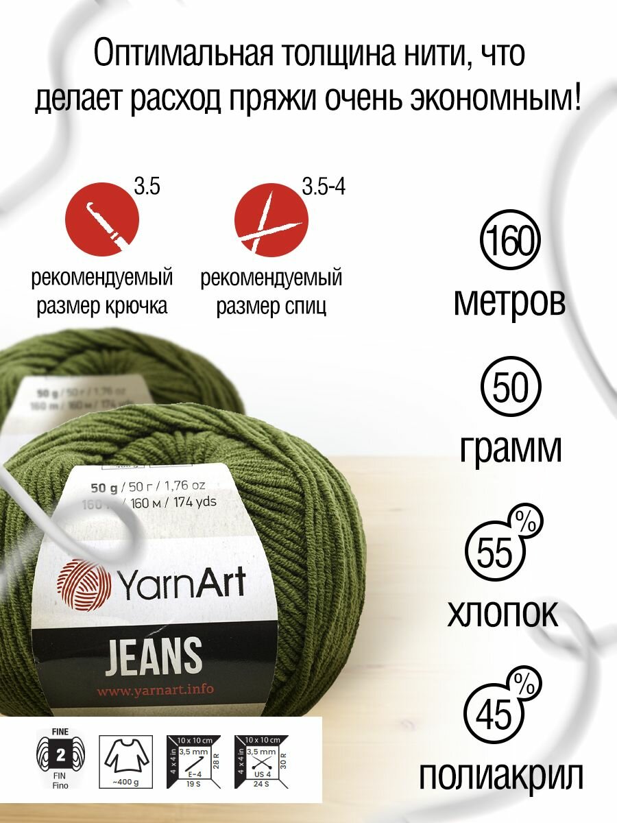 Пряжа для вязания YarnArt 'Jeans' 50г, 160м (55% хлопок, 45% полиакрил) (82 темно-оливковый), 10 мотков информация: