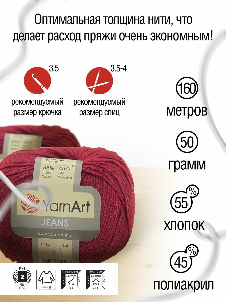 Пряжа для вязания YarnArt 'Jeans' 50г, 160м (55% хлопок, 45% полиакрил) (51 красный), 10 мотков информация: