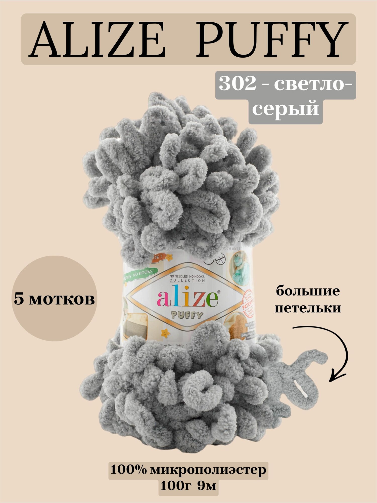 10 цен на Пряжа для вязания плюшевая с петельками Alize Puffy, цвет 302 светло-серый, 100г, 9м, 5 шт/упак