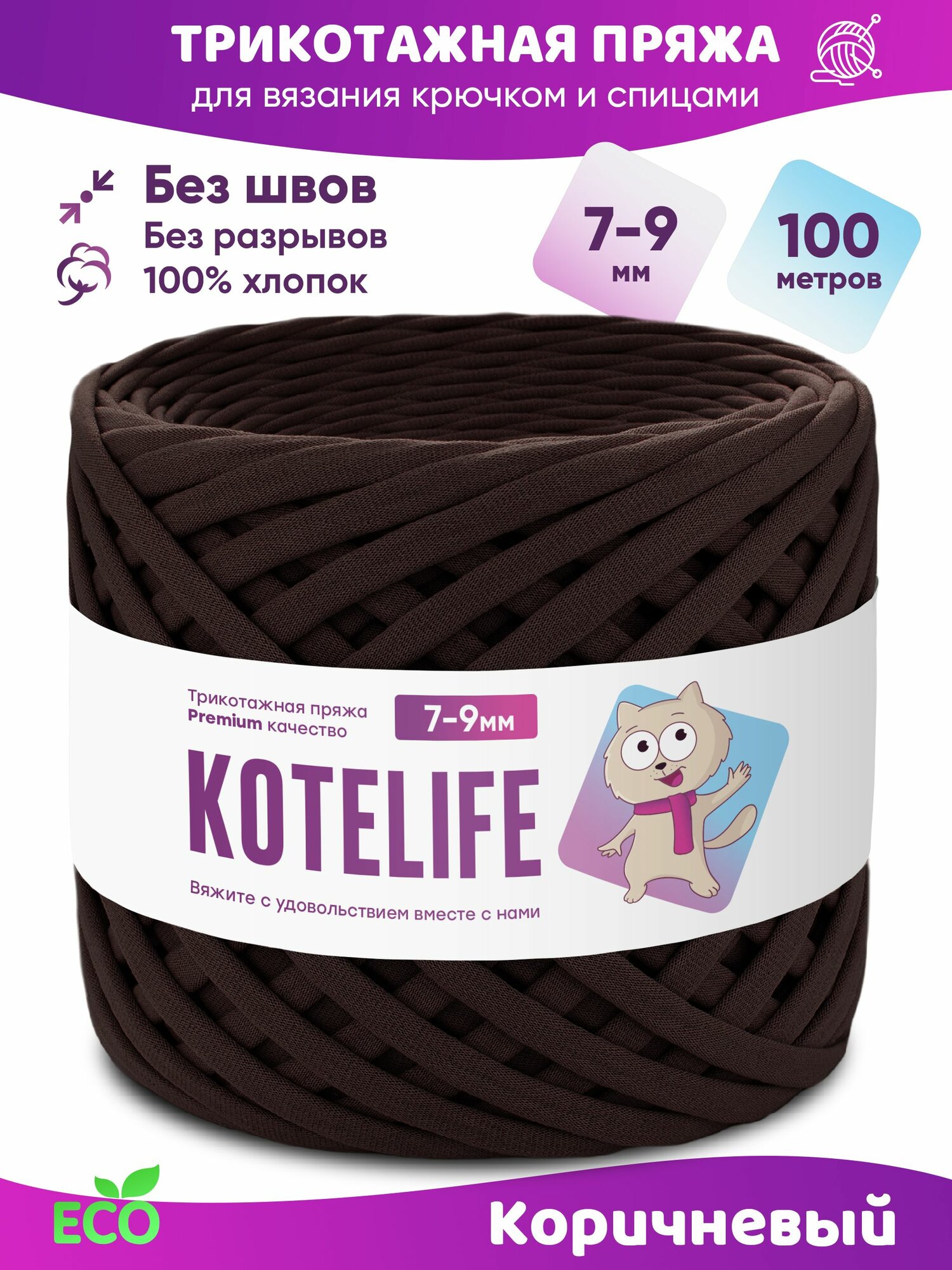 Трикотажная пряжа для вязания, 100% хлопок, 7-9мм, 100м, цвет Коричневый информация: