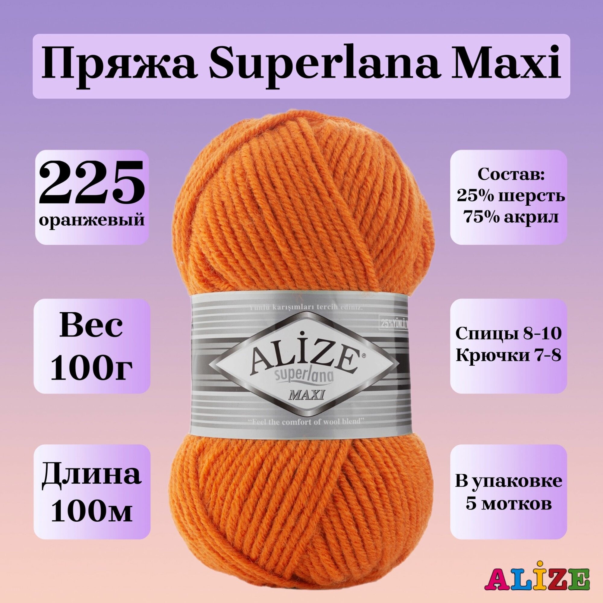 Пряжа для вязания Alize Superlana Maxi, цвет 225 оранжевый, 100г, 100м, 5шт/упак информация: