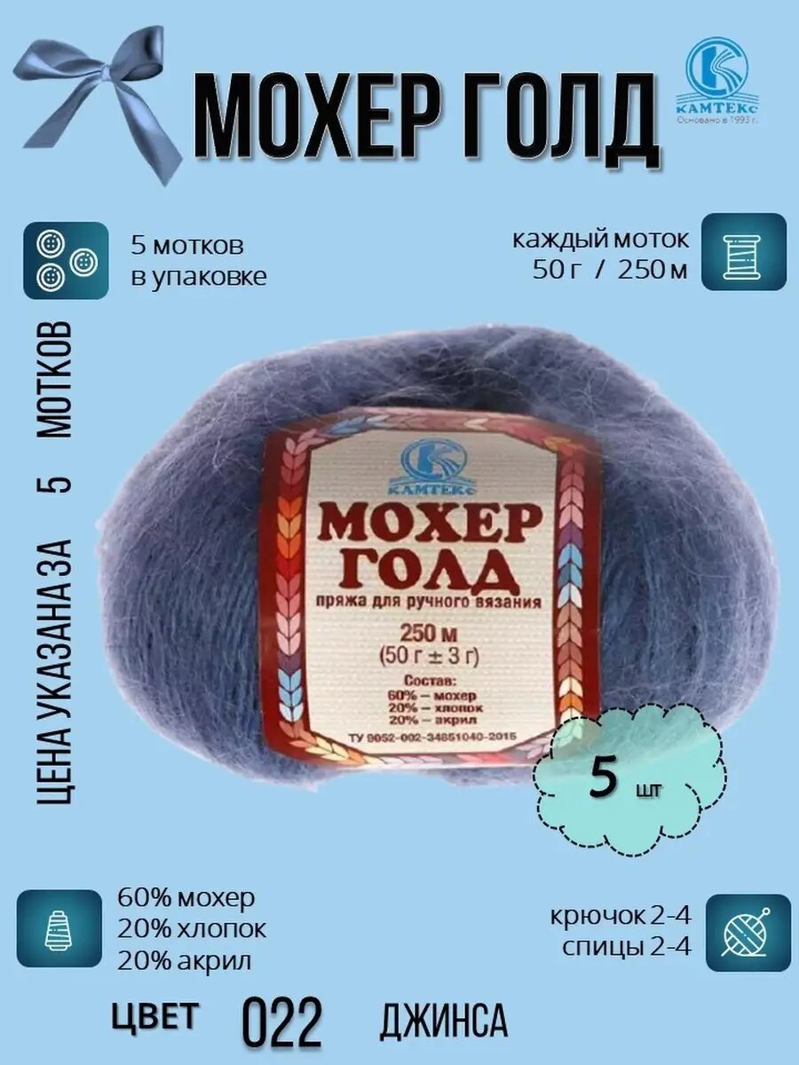 Пряжа Мохер Голд от Камтекс. джинса 022, 3 шт*50г/250 м