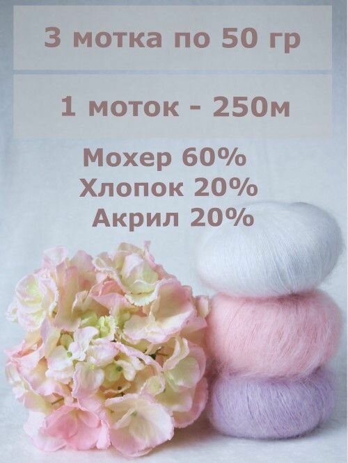 Пряжа Мохер Голд от Камтекс. Ассорти 18: белый, розовый песок, лаванда. 3 шт*50г/250 м информация:
