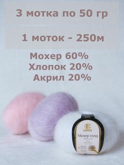 10 цен на Пряжа Мохер Голд от Камтекс. Ассорти 18: белый, розовый песок, лаванда. 3 шт*50г/250 м