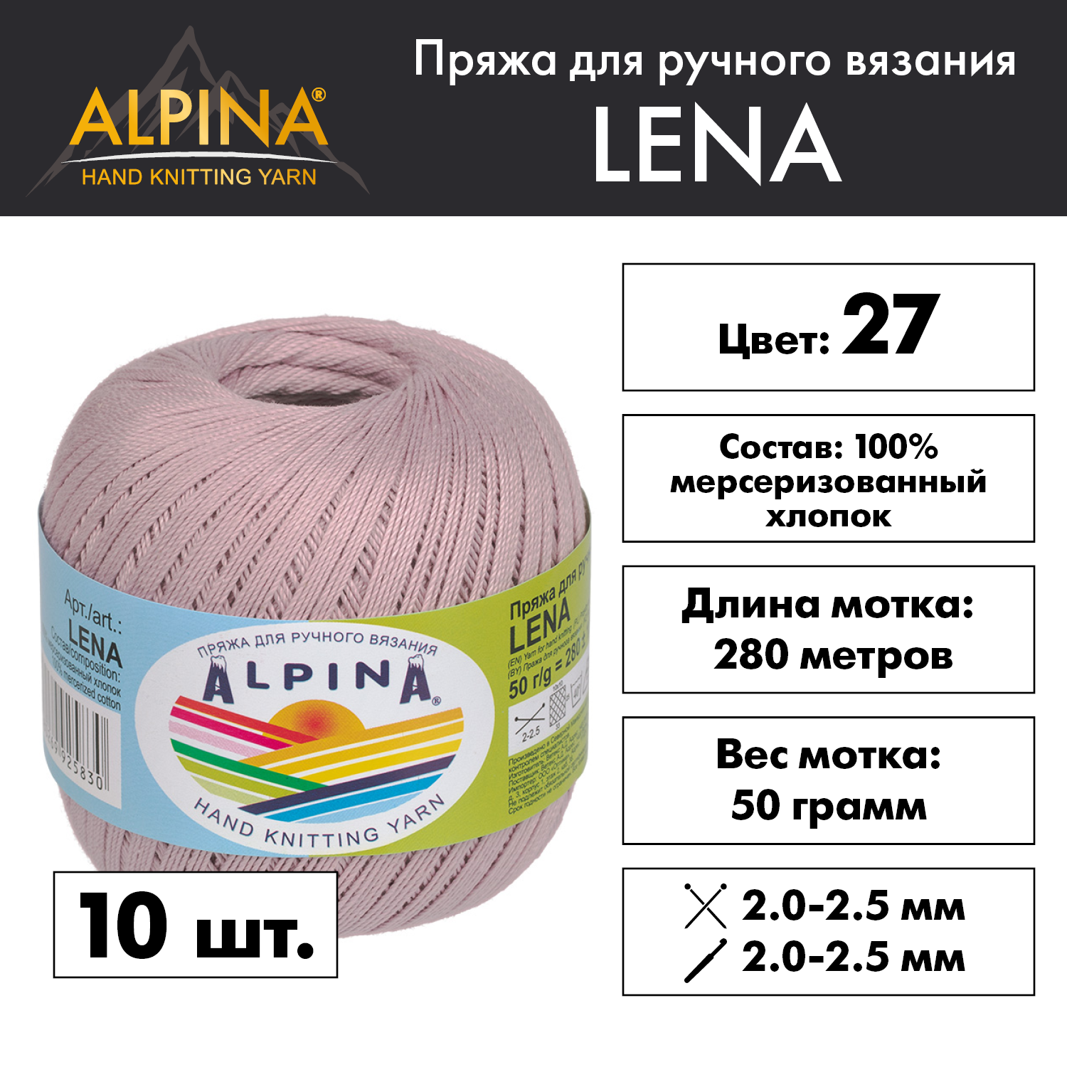 10 цен на Пряжа Alpina "LENA" 10 шт. по 50 г 100% мерсеризованный хлопок 280 м №27 гр. сиреневый