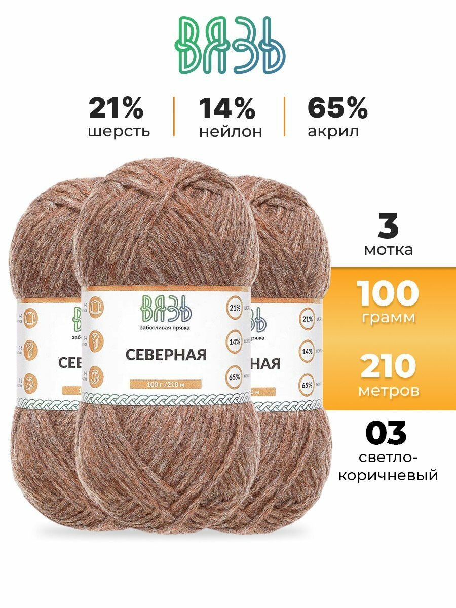 10 цен на Пряжа для вязания Вязь 'Северная' 100г, 210м (21% шерсть, 14% нейлон, 65% акрил) (03 светло-коричневый), 3 мотка