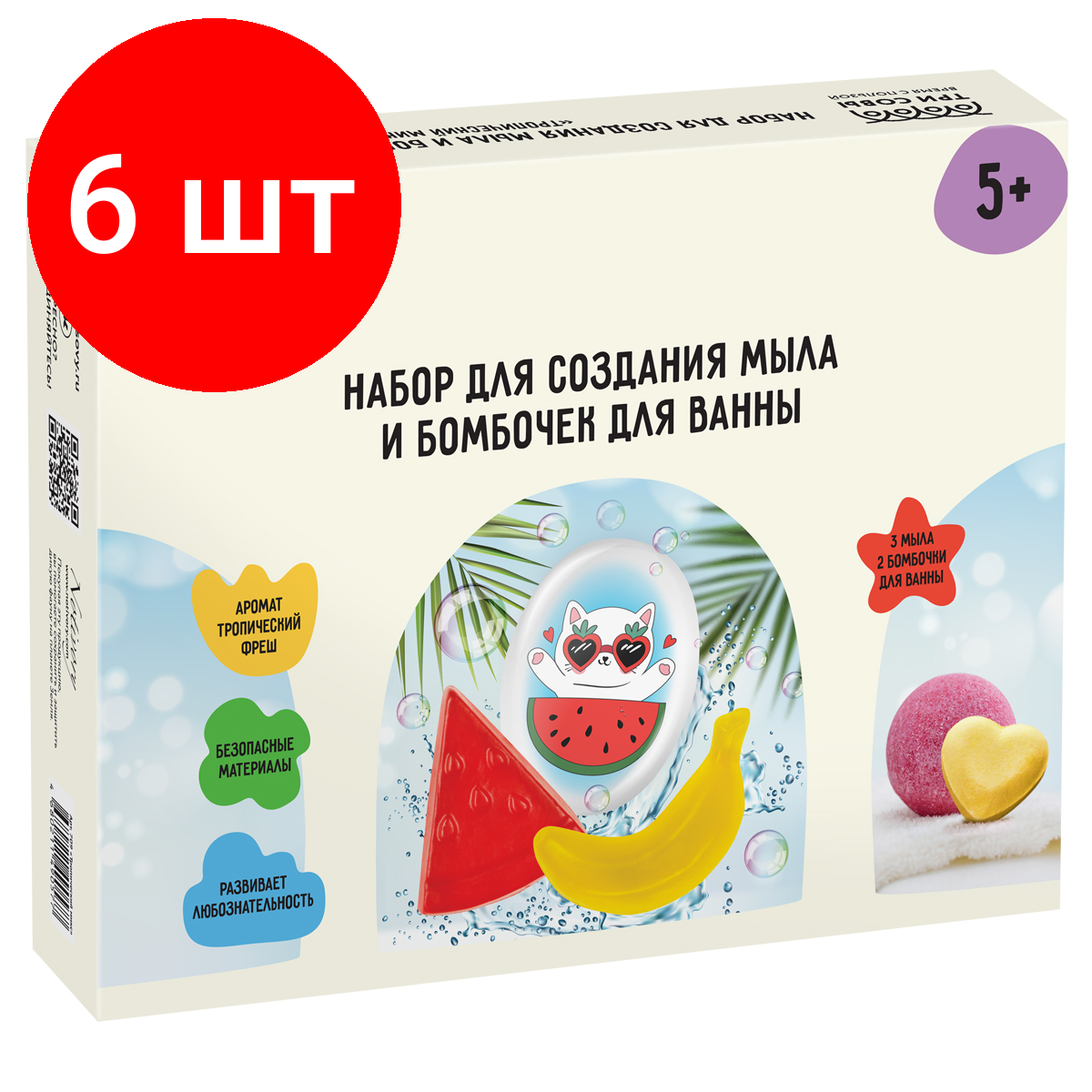 Комплект 6 шт, Набор для мыловарения 5в1 ТРИ совы "Тропический микс", 1 мыло с картинкой, 2 классических мыла, 2 бомбочки картонная коробка информация: