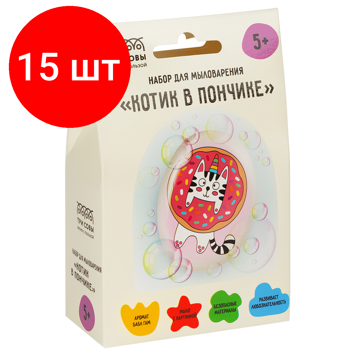 10 цен на Комплект 15 шт, Набор для мыловарения ТРИ совы "Котик в пончике", 1 мыло с картинкой, картонная коробка