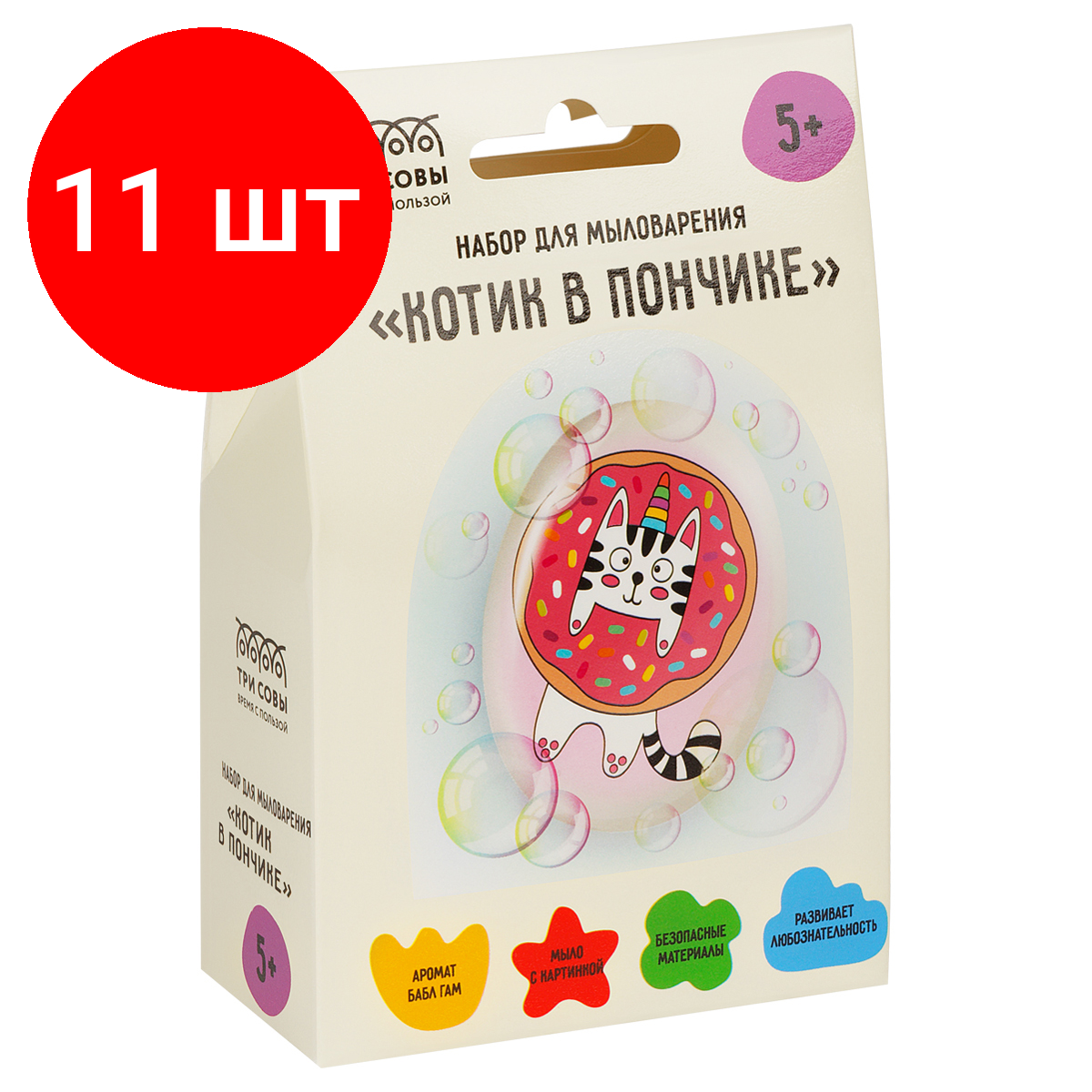 10 цен на Комплект 11 шт, Набор для мыловарения ТРИ совы "Котик в пончике", 1 мыло с картинкой, картонная коробка