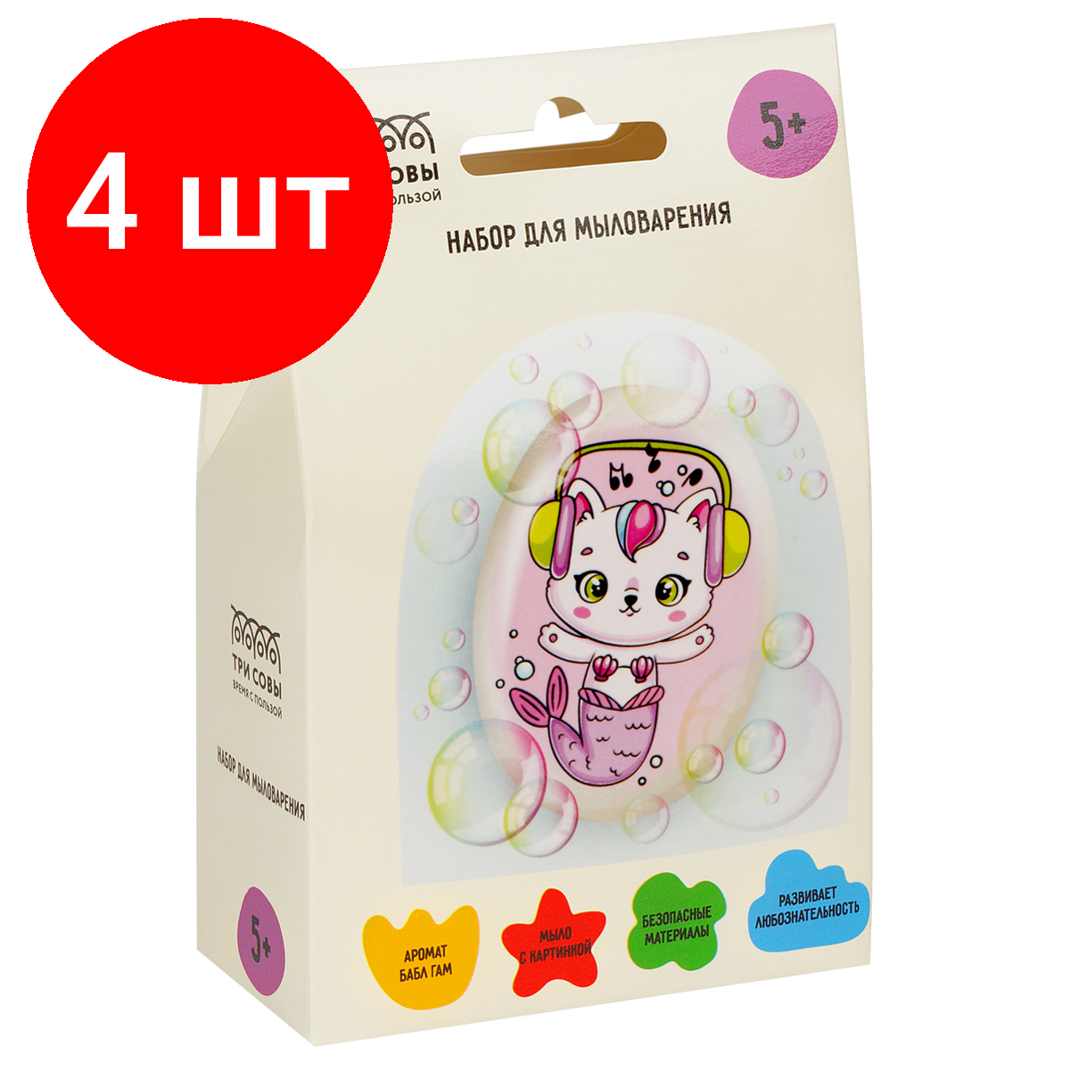Комплект 4 шт, Набор для мыловарения ТРИ совы "Которусалка", 1 мыло с картинкой, картонная коробка информация: