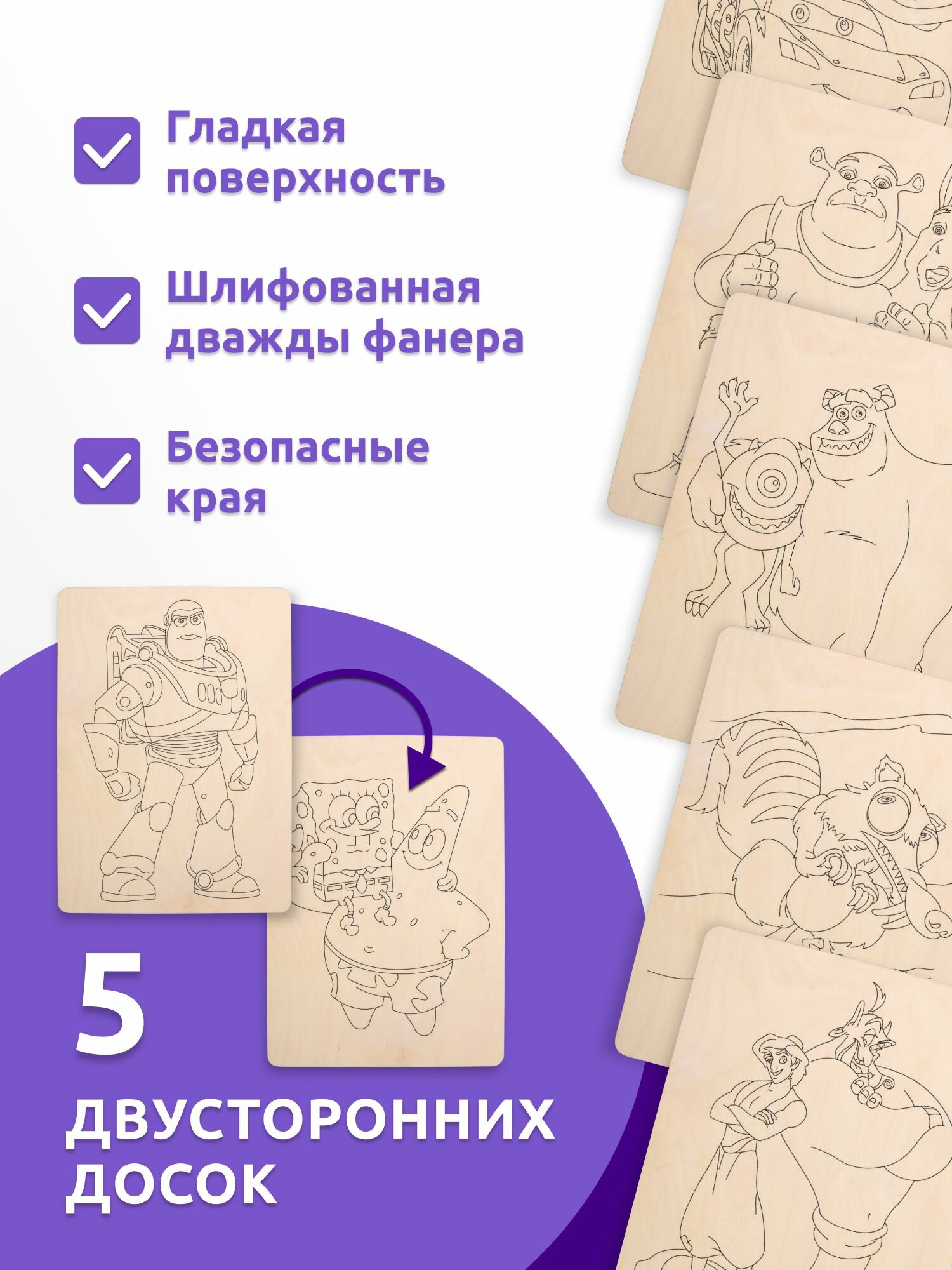 Набор деревянных досок А5 для выжигания по дереву MEGA TOYS детский из фанеры с рисунком Мультфильмы информация: