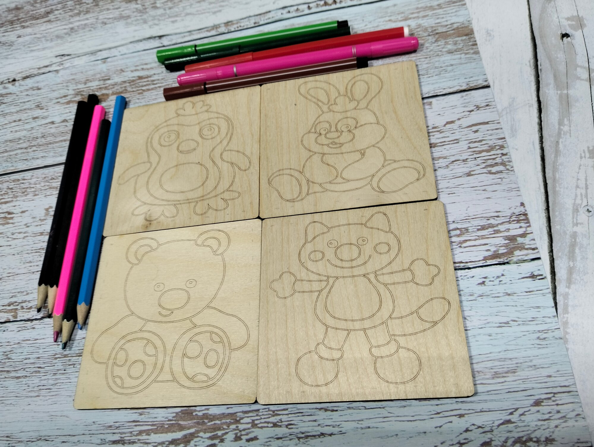 Набор для раскрасок и выжигания, выжигание и раскрашивания по дереву."Зверюшки", 10х10 см, 4шт. информация: