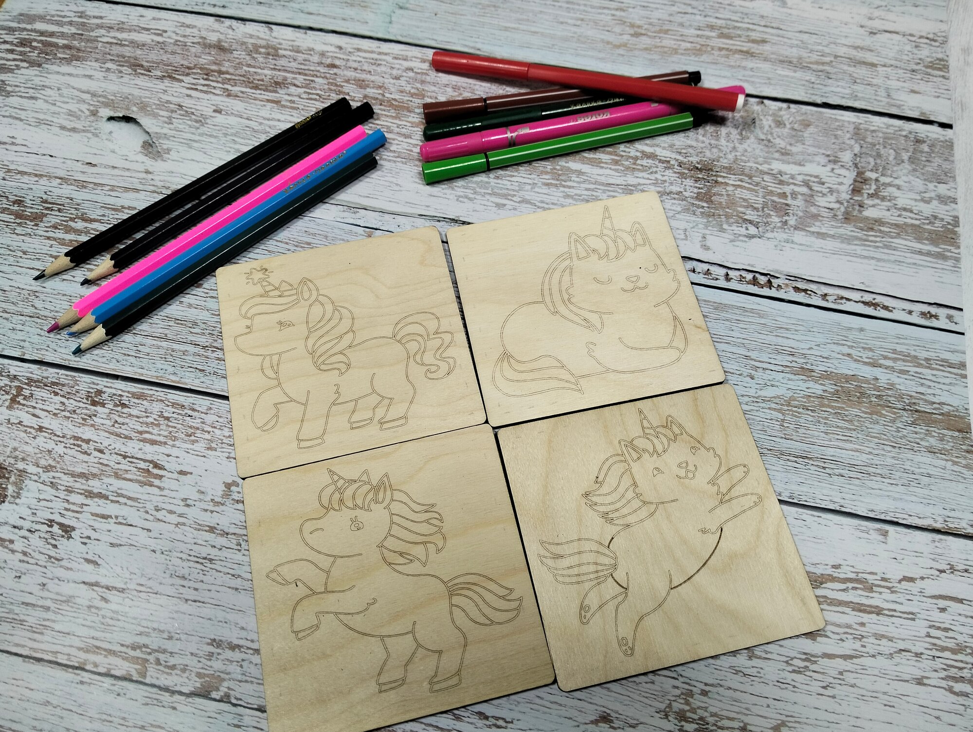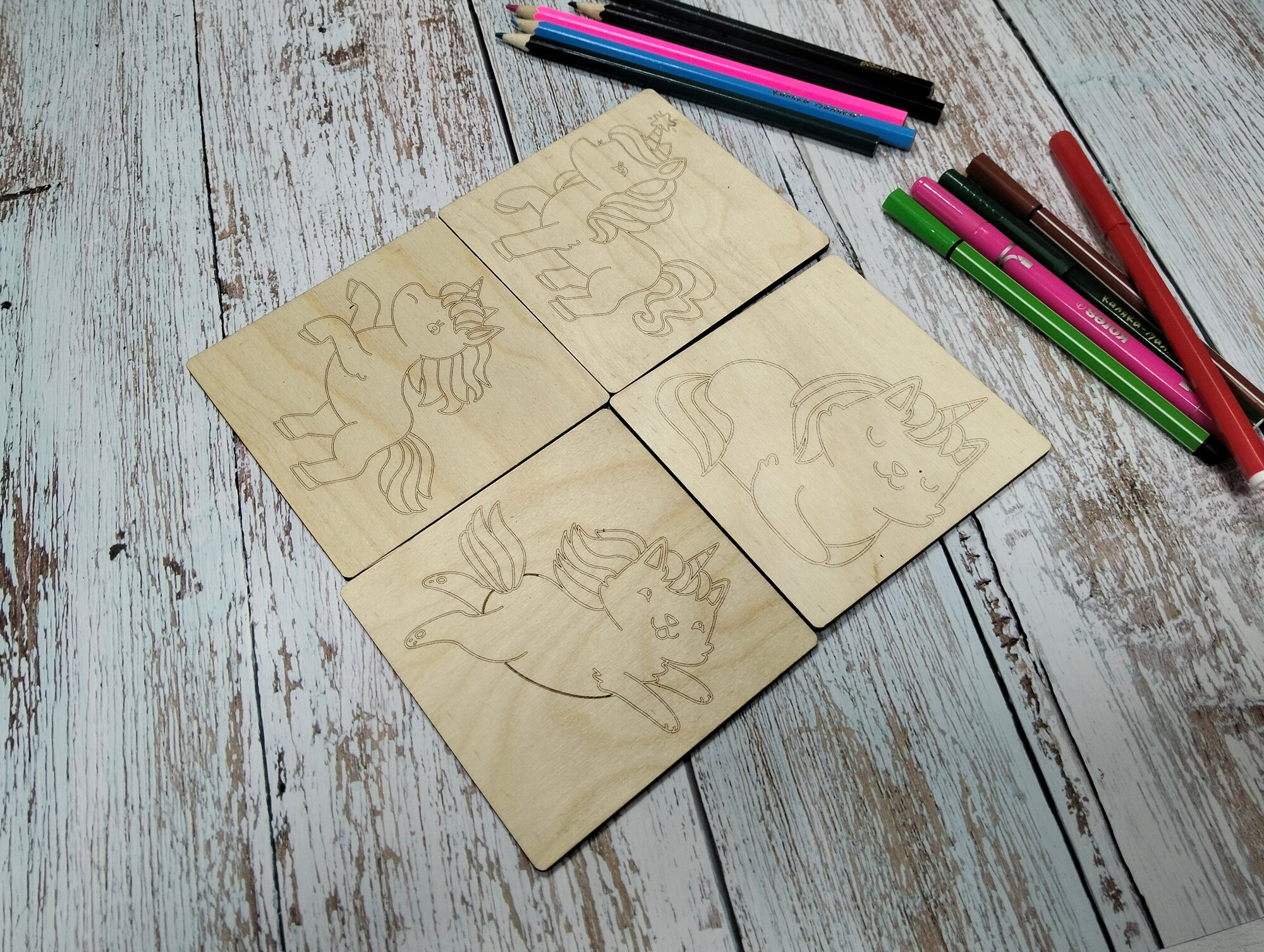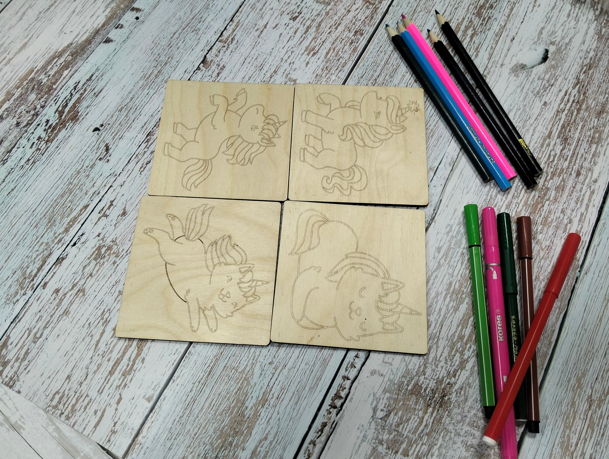 Набор для раскрасок и выжигания, выжигание и раскрашивания по дереву."Единороги", 10х10 см, 4шт. информация: