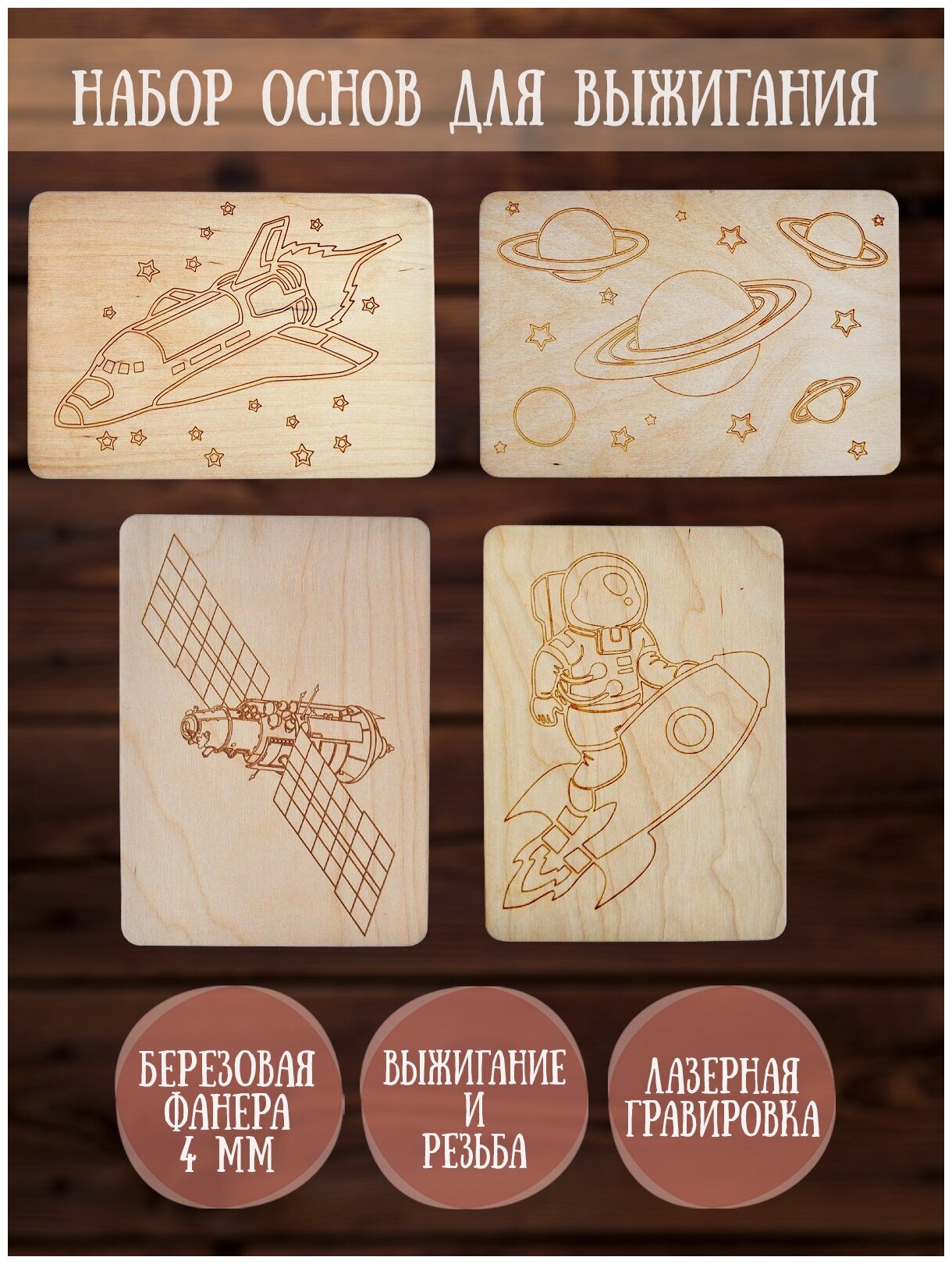 Набор основ для выжигания по дереву, доска для рисования RiForm с рисунком "Космическое Приключение", формат А5, 4шт, фанера 4мм информация: