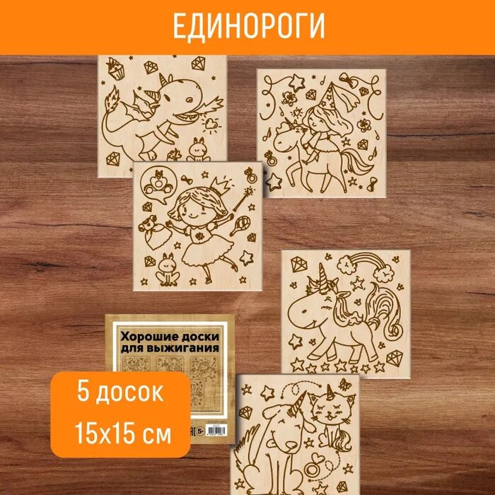 Набор досок для выжигания Раскрась и подари Единороги 15х15 см 5 шт. информация: