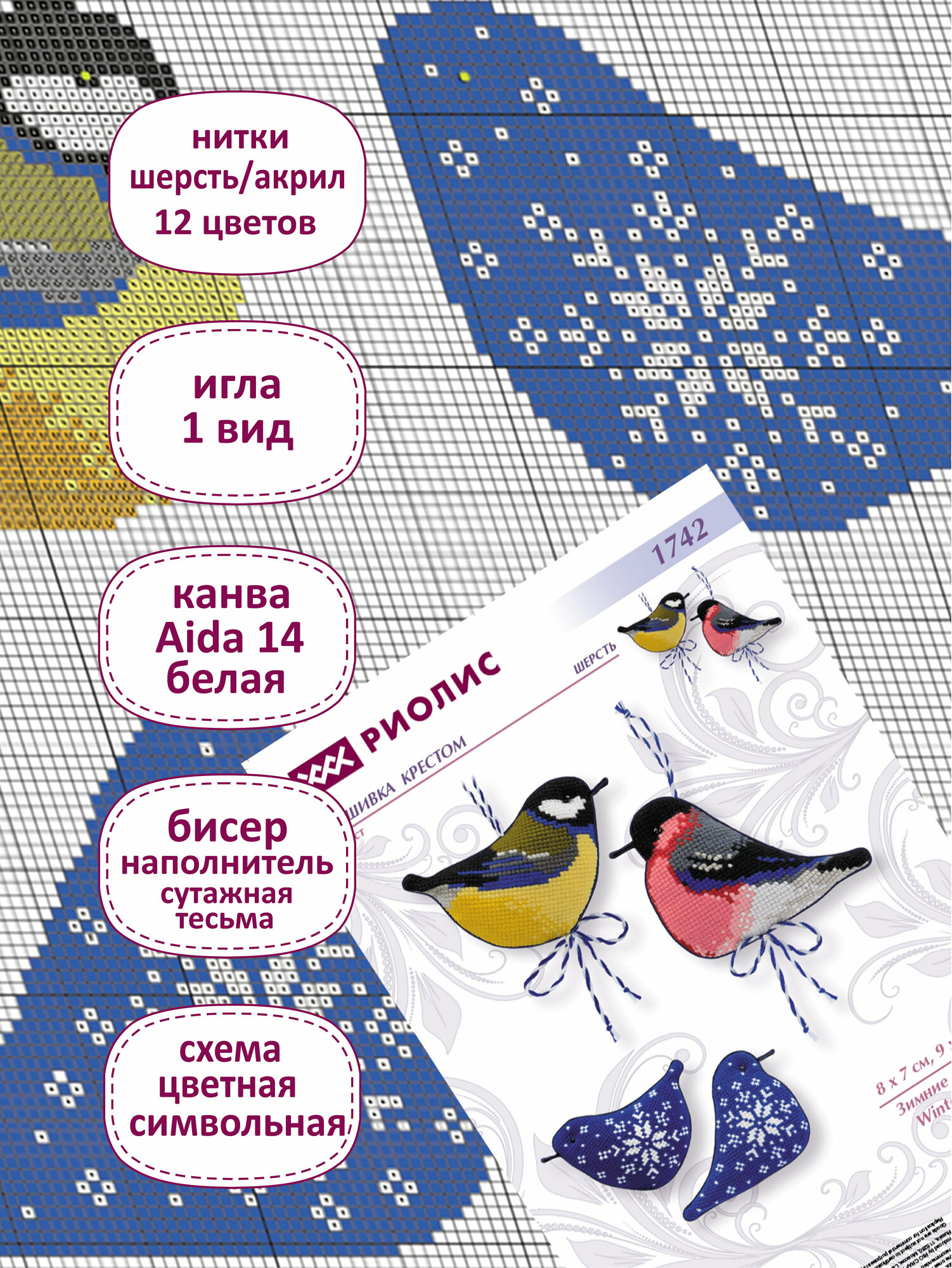 10 цен на Набор для вышивания крестом Риолис, вышивка крестиком Игрушки "Зимние птички", 8*7см, 1742