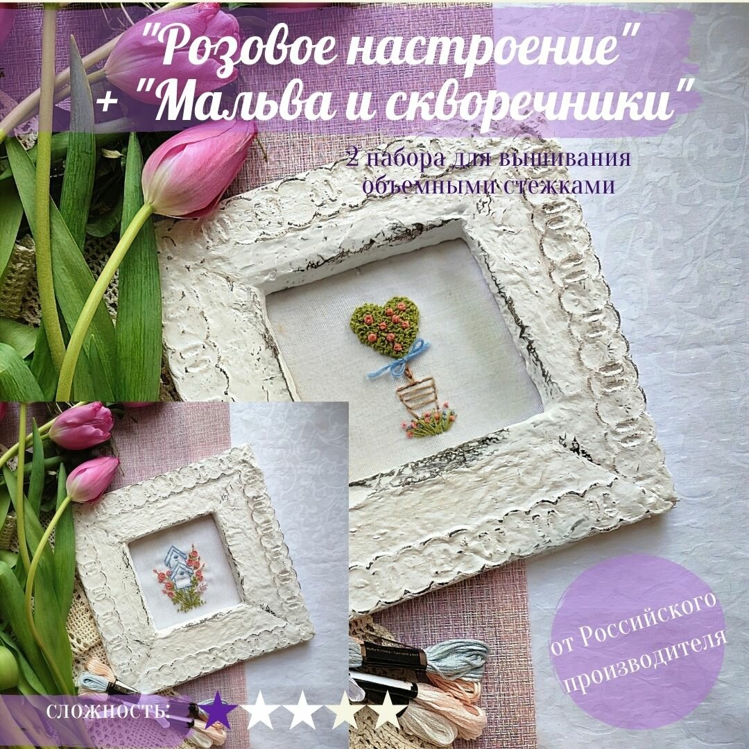 Комплект из 2 наборов для винтажной мини вышивки объемными стежками / Размер 6х7см / Для начинающих информация: