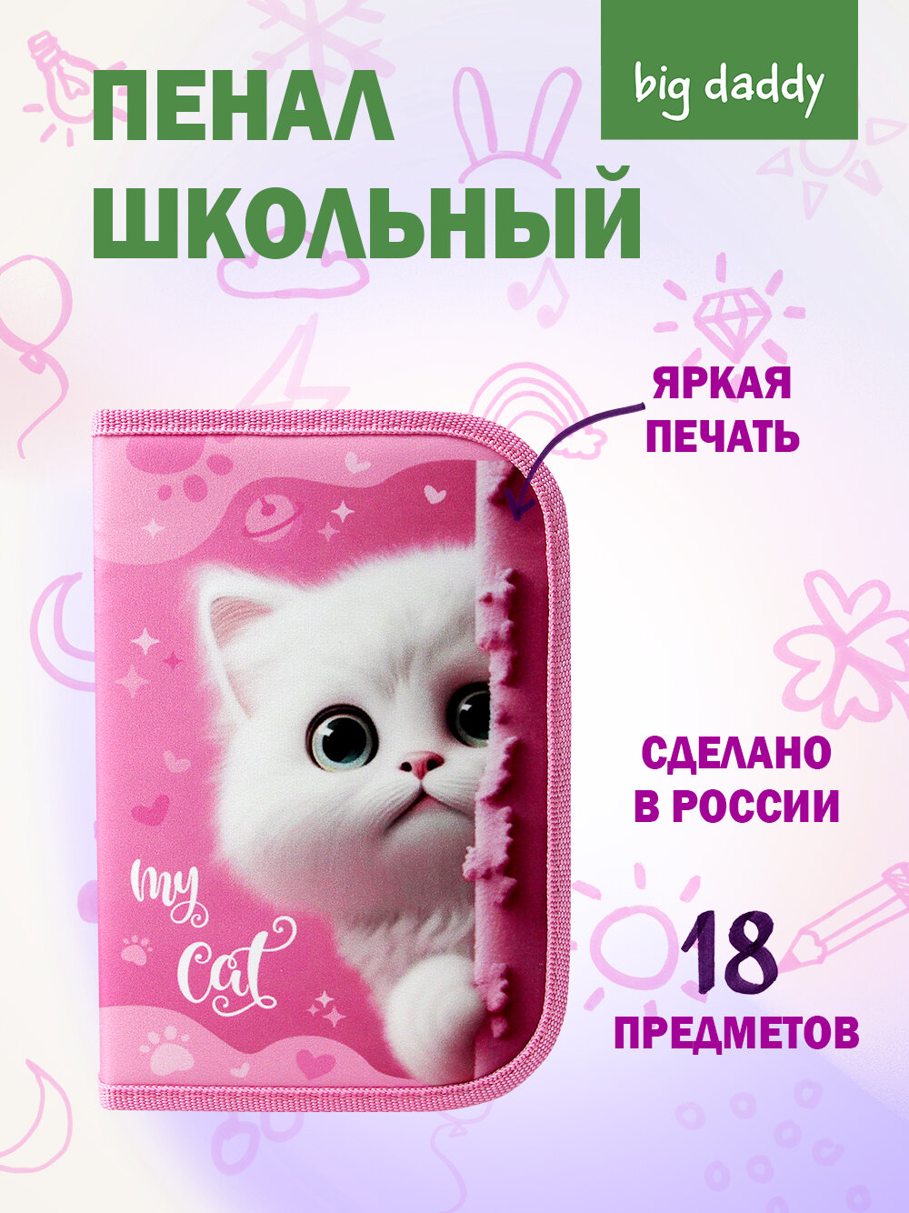 Пенал bigdaddy "Белый котик", школьный, 1 отделение, с откидной планкой информация: