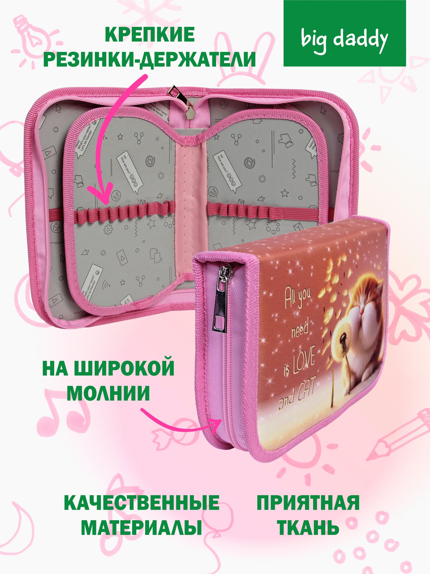 Пенал школьный BigDaddy, тканевый, три секции, два блока 14 см x 21 см x 4 см smart block "Девочка-любовь" 549 ₽