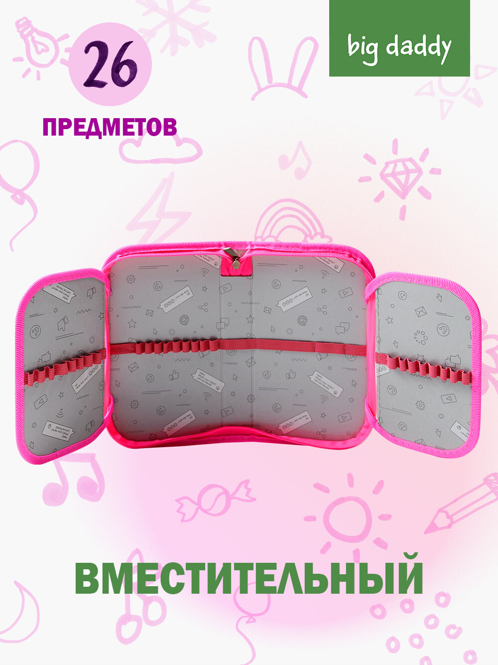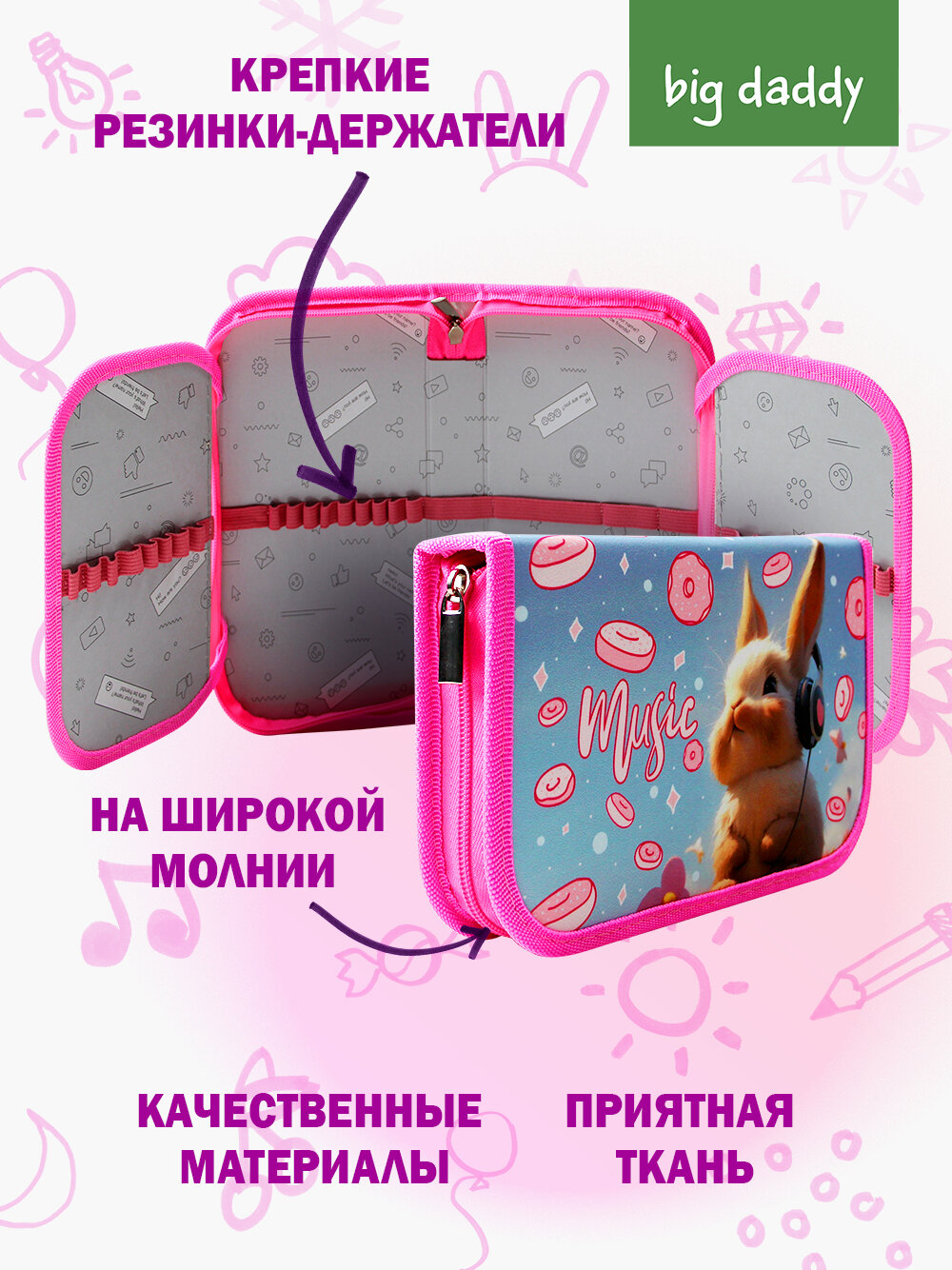 Пенал школьный bigdaddy 1 отделение 2 откидные секции 130*210*35мм "Крутой зайка" информация: