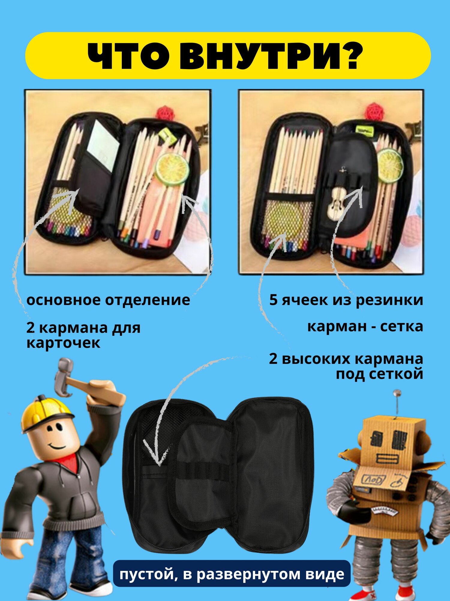 Отзывы на Пенал школьный для мальчиков и подростков роблокс (с героями Roblox) на молнии с отделением для карандашей, ручек и канцелярии мягкий.