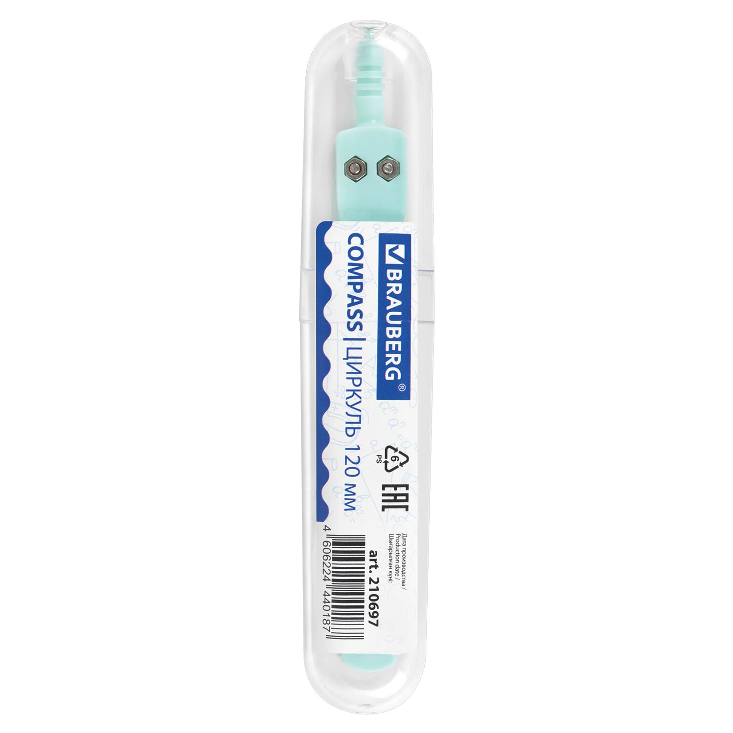 Циркуль чертежный для школы 120 мм, защитный колпачок, пластиковый пенал, цвет пастельный бирюзовый, Brauberg Geometry, 210697 информация: