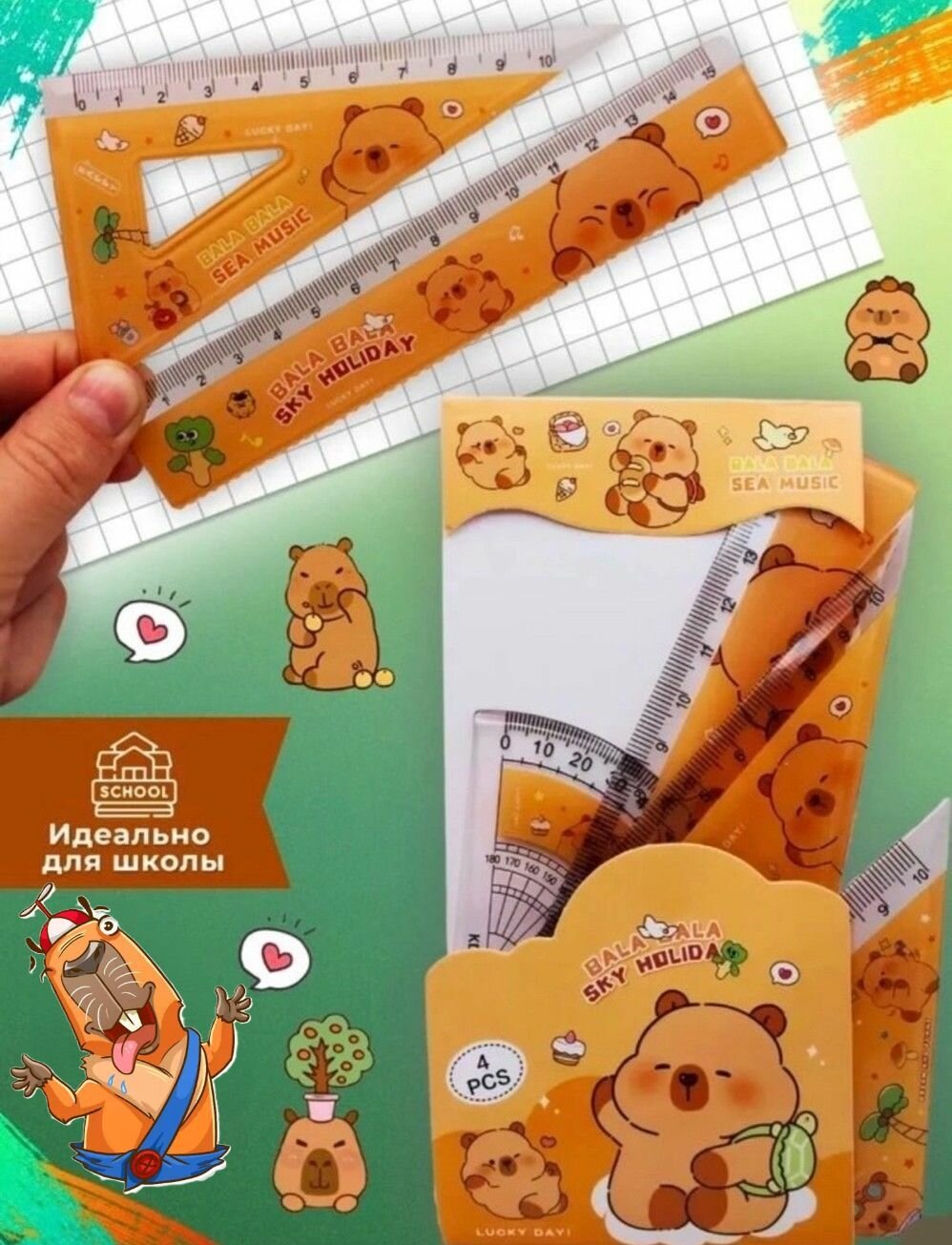 Отзывы на Набор линеек " Капибара " (линейка-15см, угольник-2шт, транспортир-1шт).
