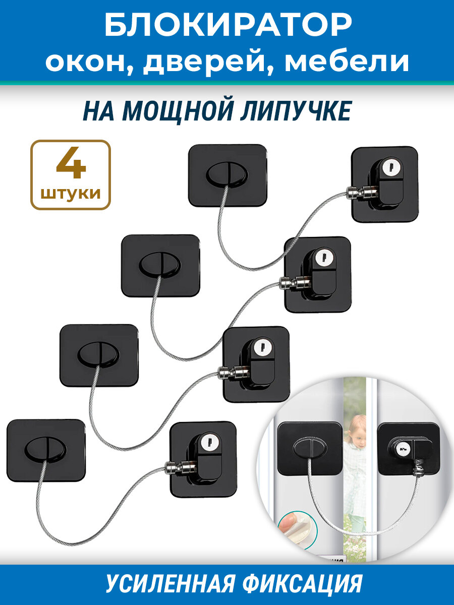 Лот 4 шт: Блокиратор мебели, холодильника, дверей, окна на липучке с тросом, черный информация: